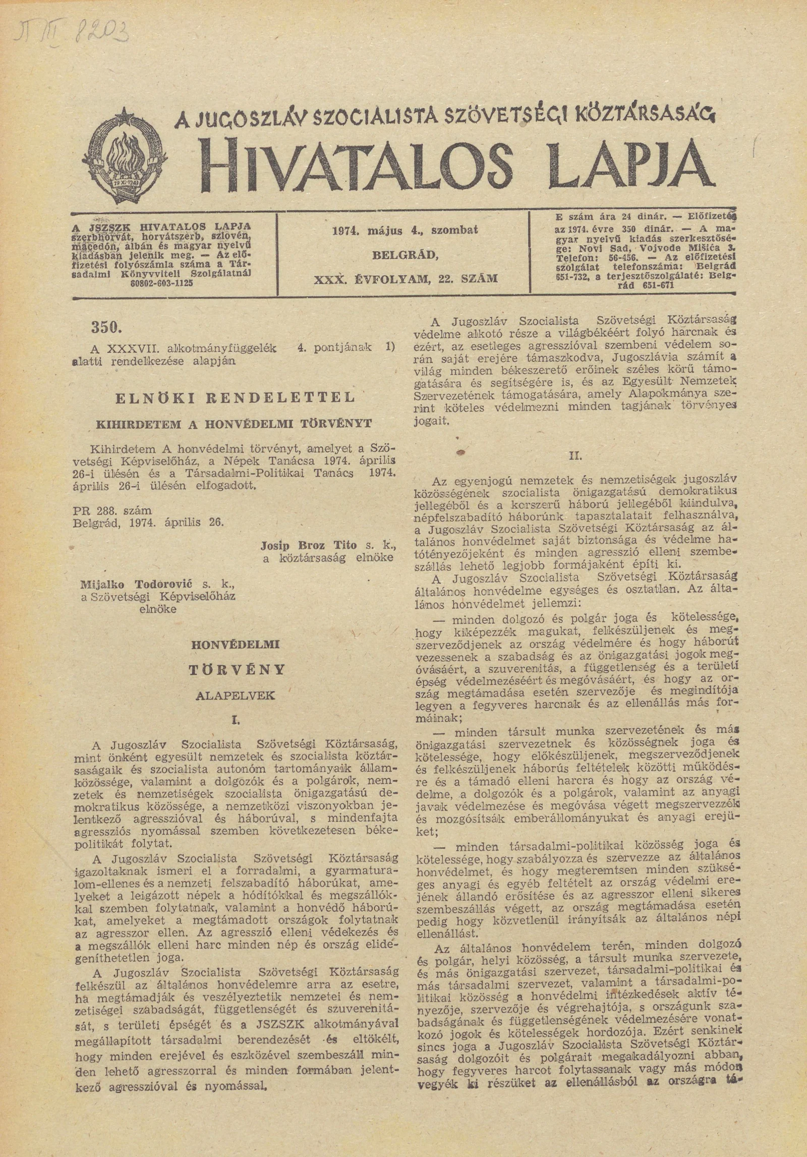 A Jugoszláv Szocialista Szövetségi Köztársaság Hivatalos Lapja, 30. évf. 1974. május 4. 22. sz. 645–740. oldal