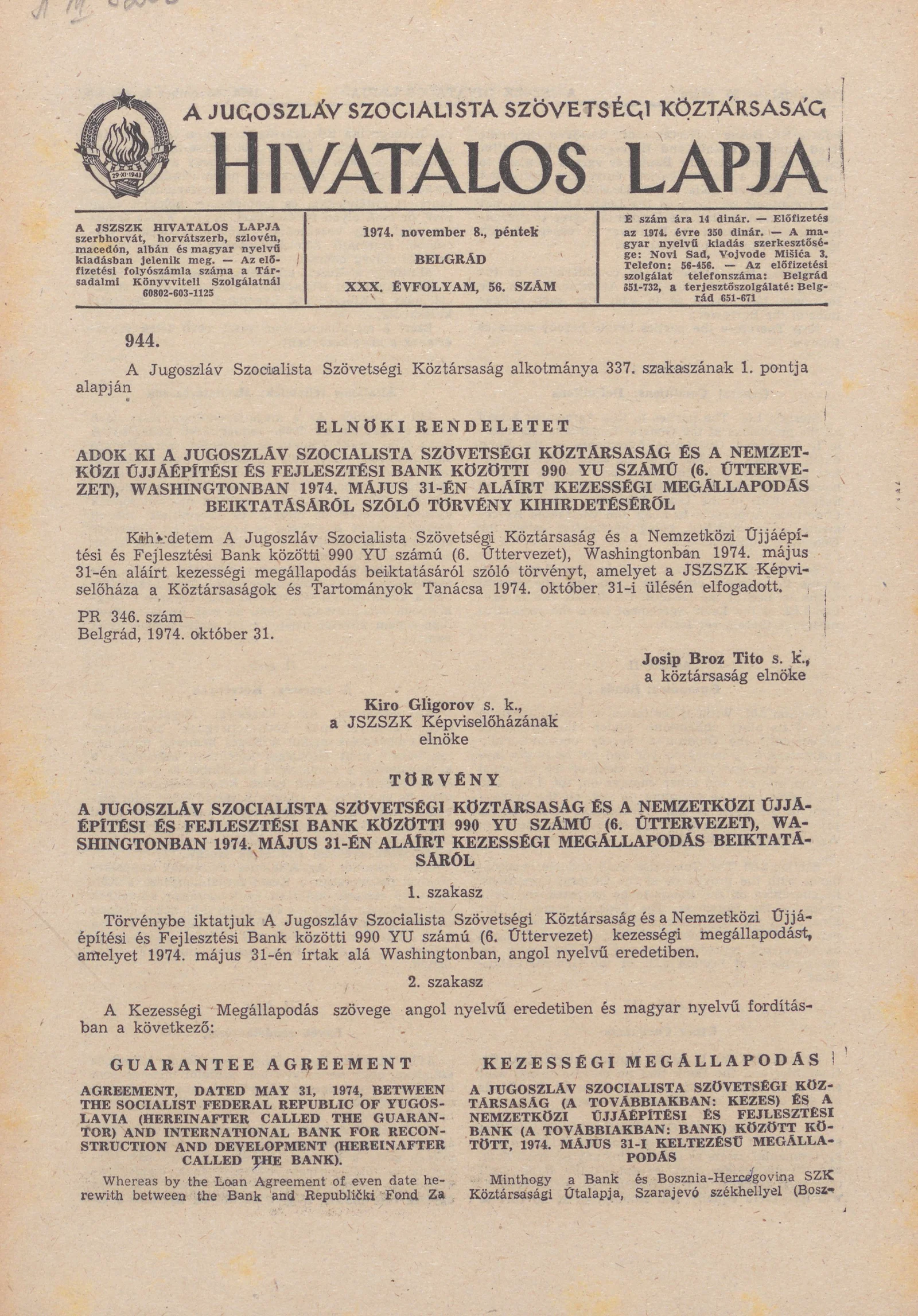 - Törvény a Jugoszláv Szocialista Szövetségi Köztársaság és a Nemzetközi Újjáépítési és Fejlesztési Bank közötti 990 YU számú (6. úttervezet), Washingtonban 1974. május 31-én aláírt kezességi megállapodás beiktatásáról1757