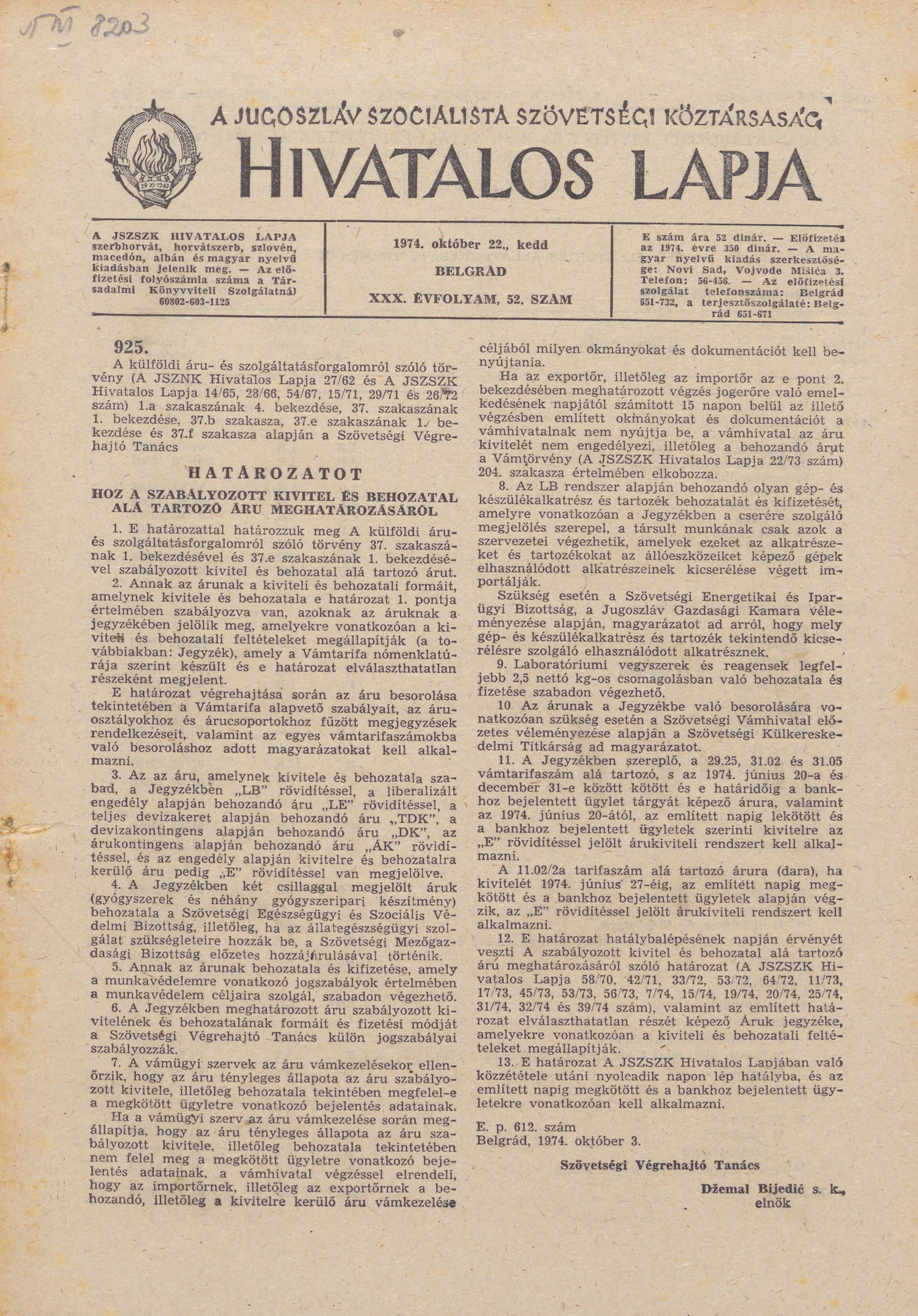 A Jugoszláv Szocialista Szövetségi Köztársaság Hivatalos Lapja, 30. évf. 1974. október 22. 52. sz. 1501–1708. oldal