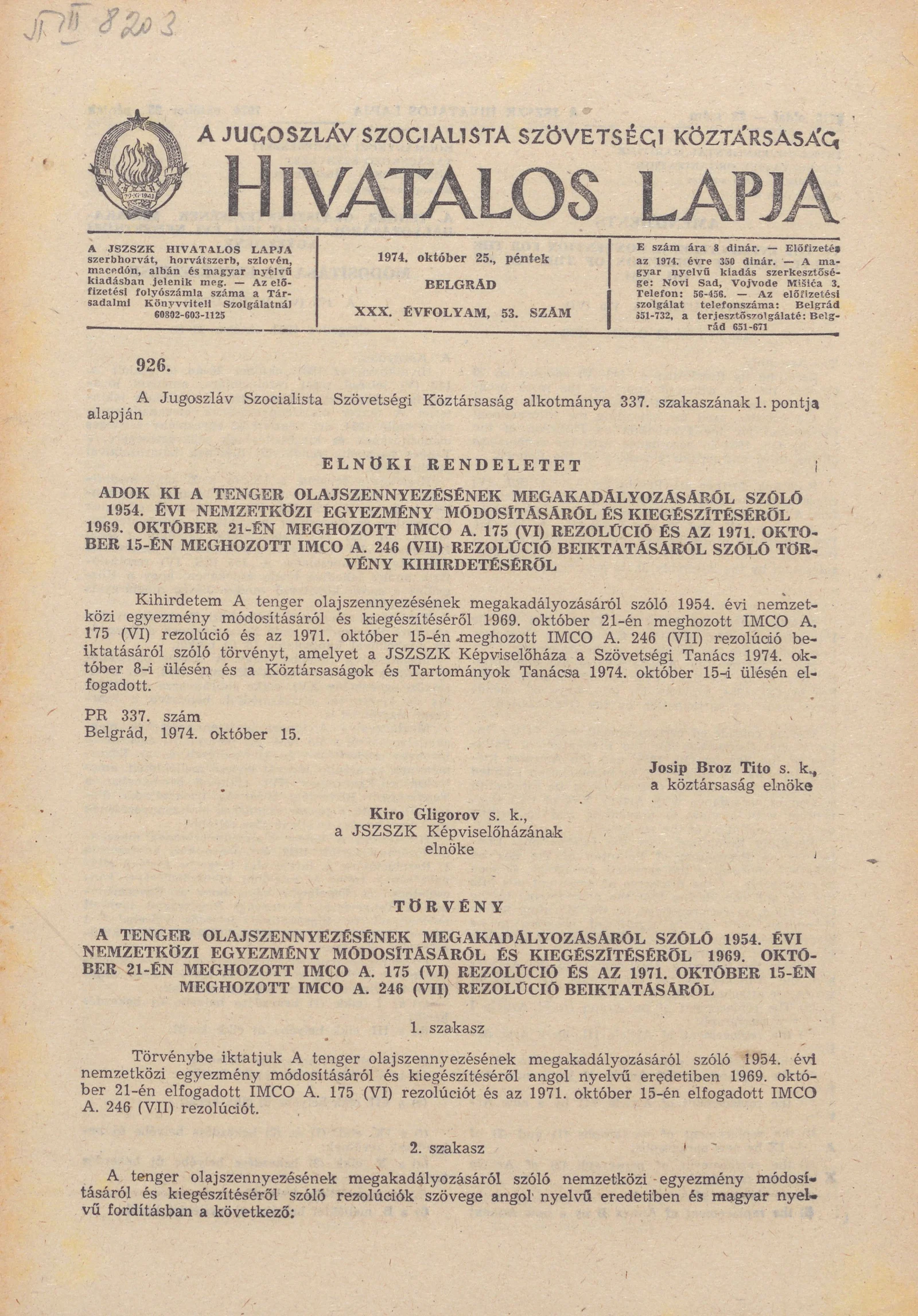 A Jugoszláv Szocialista Szövetségi Köztársaság Hivatalos Lapja, 30. évf. 1974. október 25. 53. sz. 1709–1740. oldal