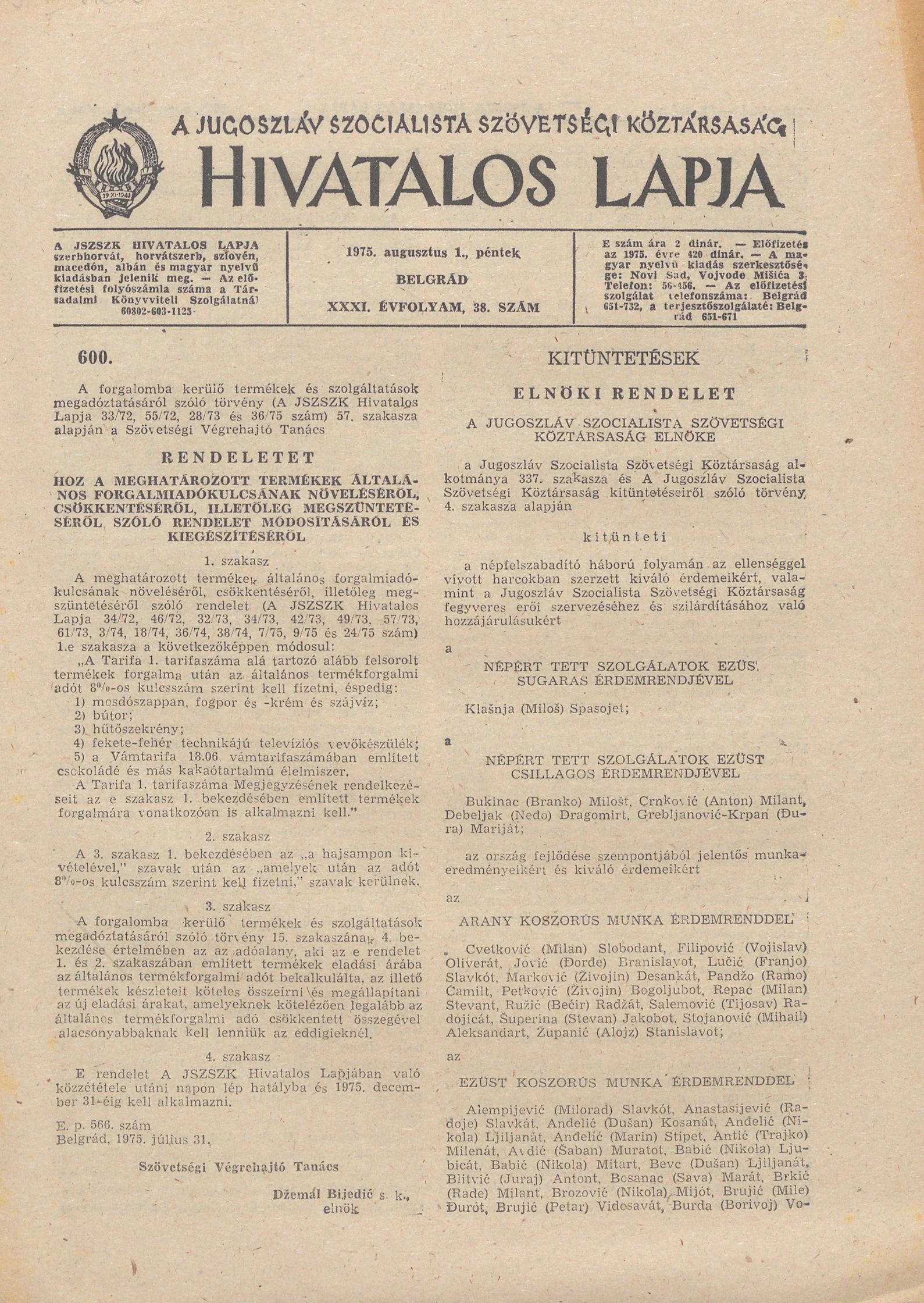 A Jugoszláv Szocialista Szövetségi Köztársaság Hivatalos Lapja, 31. évf. 1975. augusztus 1. 38. sz. 1117–1124. oldal