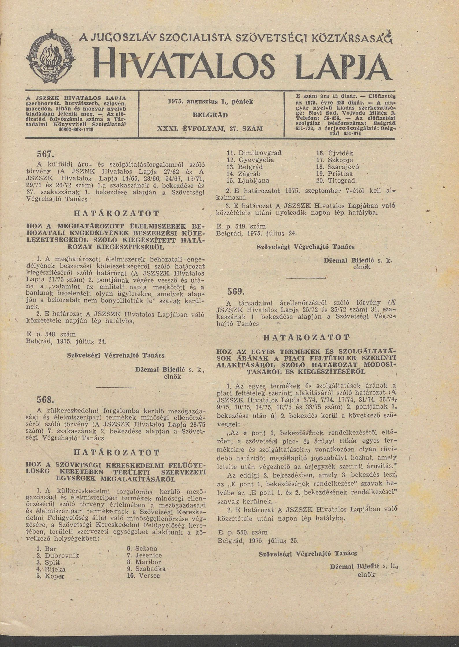A Jugoszláv Szocialista Szövetségi Köztársaság Hivatalos Lapja, 31. évf. 1975. augusztus 1. 37. sz. 1085–1116. oldal