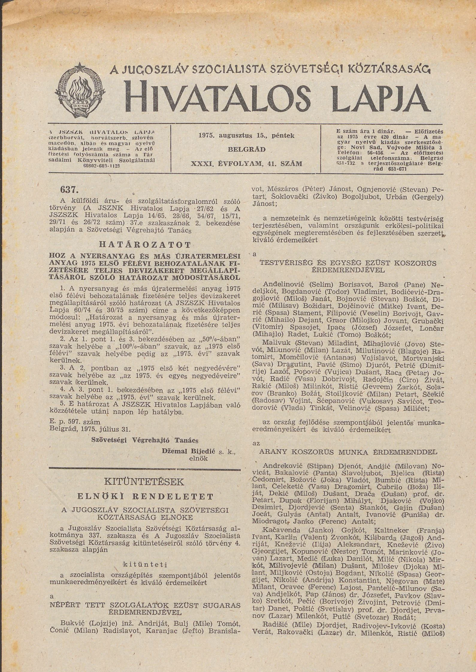 A Jugoszláv Szocialista Szövetségi Köztársaság Hivatalos Lapja, 31. évf. 1975. augusztus 15. 41. sz. 1173–1176. oldal