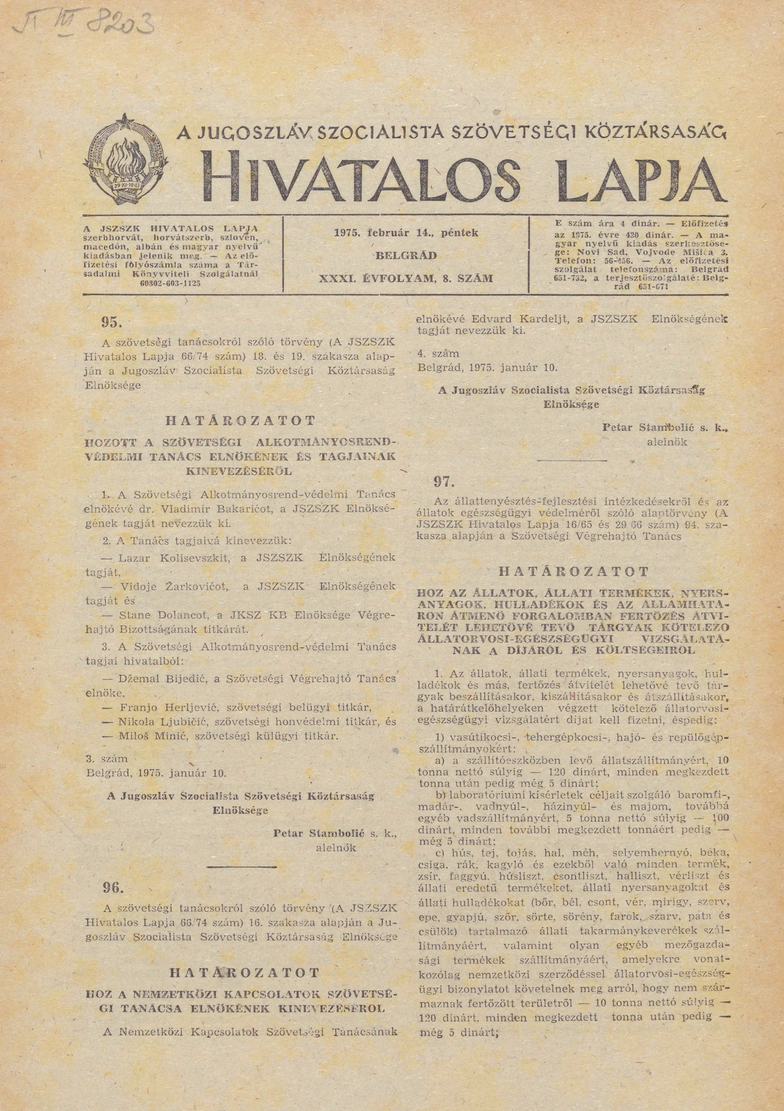 - Határozat A Jugoszlávia nemzetei és nemzetiségei számára különleges jelentőségű események alkalmából kiadásra kerülő nyakérmék, jelvények és függők termékforgalmi adólerovás alóli mentesítéséről szóló határozat kiegészítéséről202