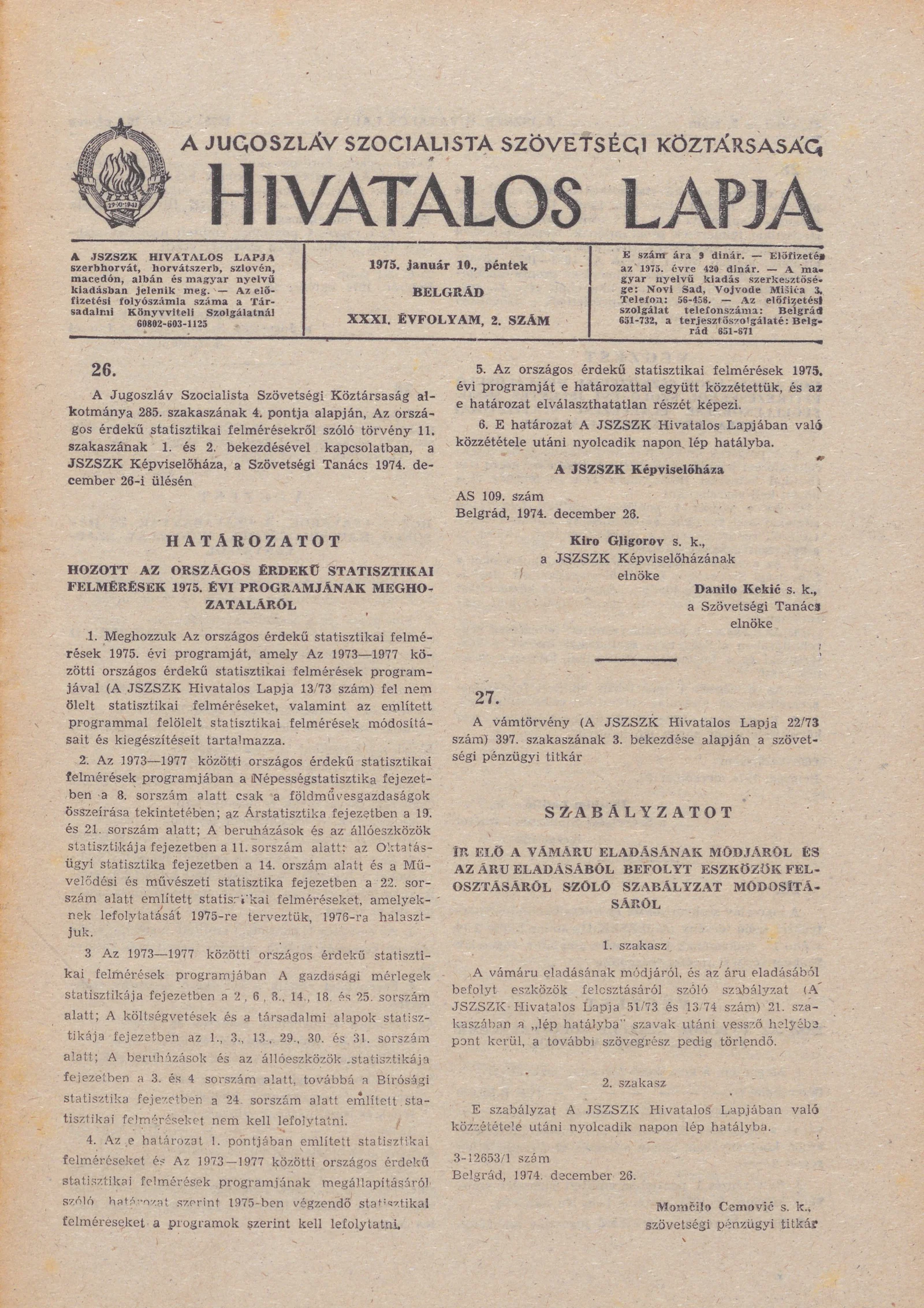 A Jugoszláv Szocialista Szövetségi Köztársaság Hivatalos Lapja, 31. évf. 1975. január 10. 2. sz. 41–76. oldal