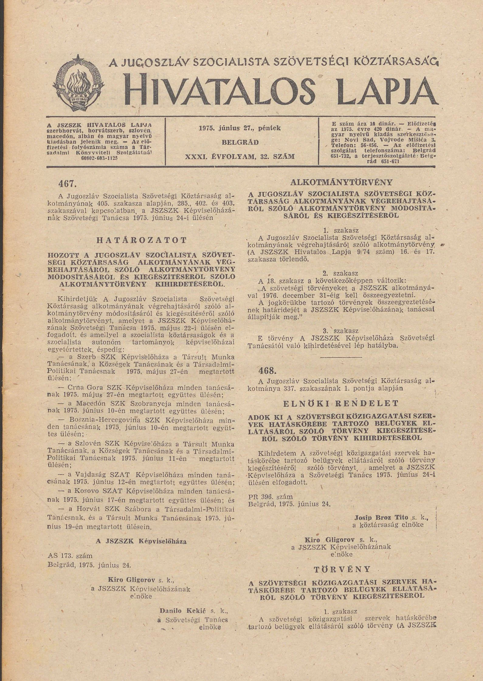 A Jugoszláv Szocialista Szövetségi Köztársaság Hivatalos Lapja, 31. évf. 1975. június 27. 32. sz. 973–996. oldal