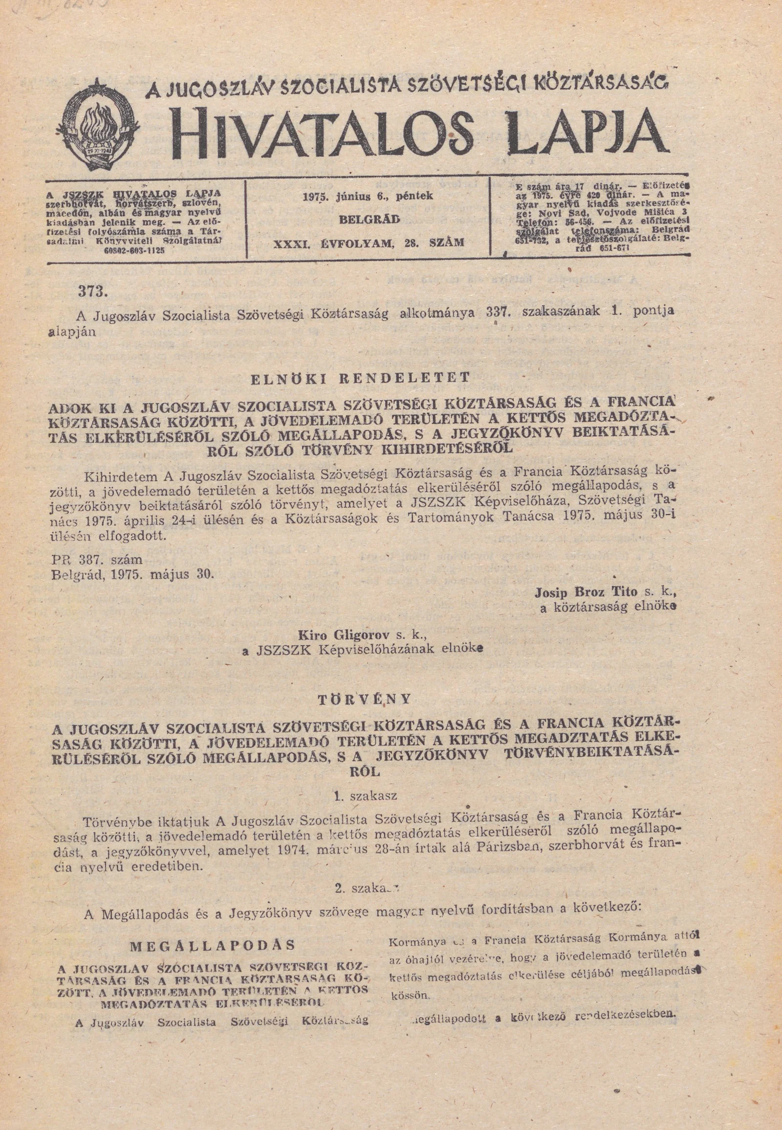 - Törvény A Jugoszláv Szocialista Szövetségi Köztársaság és a Francia Köztársaság közötti, a jövedelemadó területén a kettős megadóztatás elkerüléséről szóló megállapodás, s a jegyzőköny törvénybeiktatásáról 849