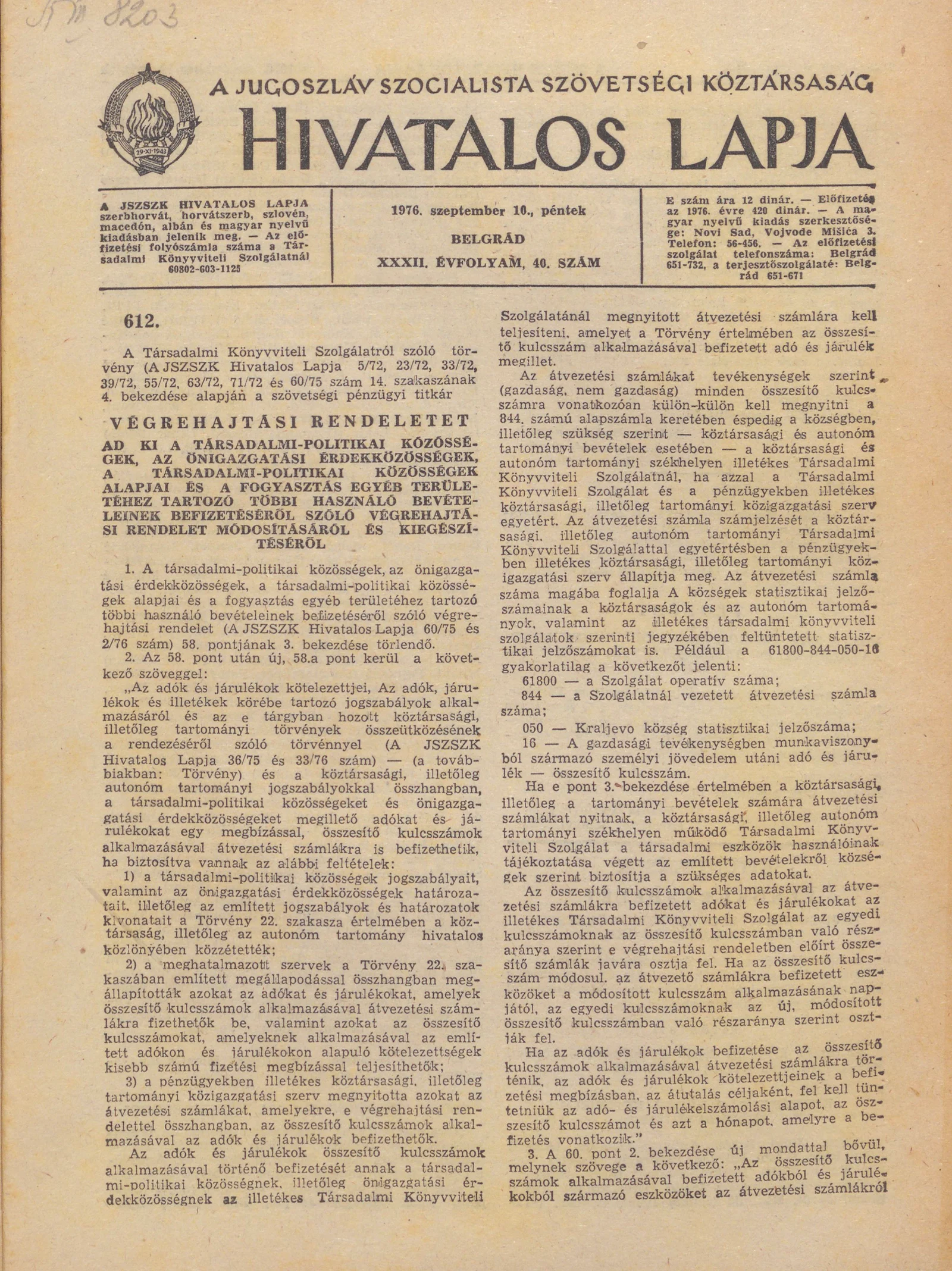A Jugoszláv Szocialista Szövetségi Köztársaság Hivatalos Lapja, 32. évf. 1976. szeptember 10. 40. sz. 1249–1256. oldal