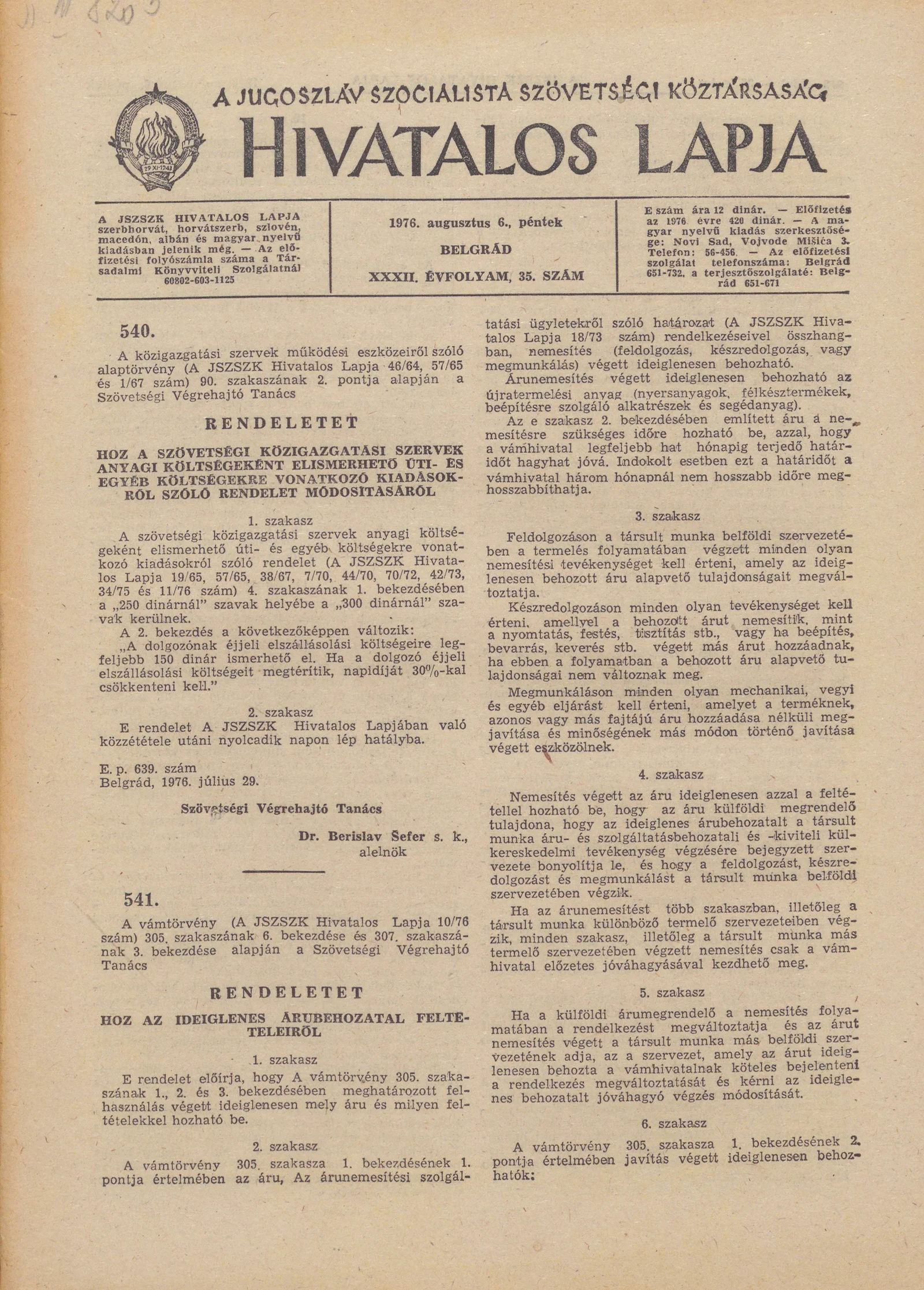 A Jugoszláv Szocialista Szövetségi Köztársaság Hivatalos Lapja, 32. évf. 1976. augusztus 6. 35. sz. 917–964. oldal