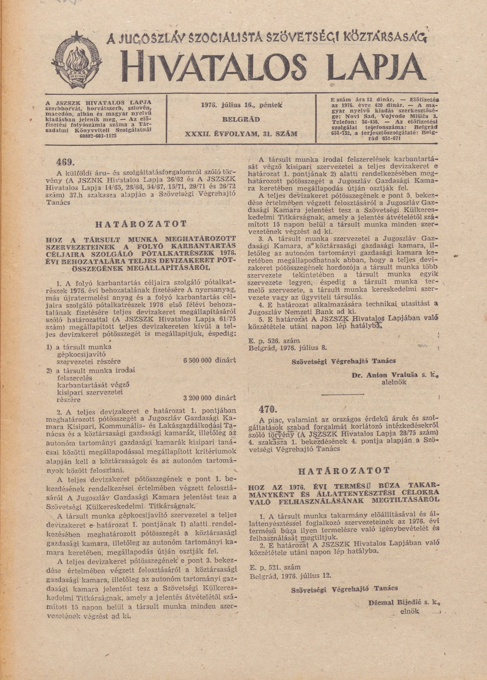 A Jugoszláv Szocialista Szövetségi Köztársaság Hivatalos Lapja, 32. évf. 1976. július 16. 31. sz. 757–780. oldal