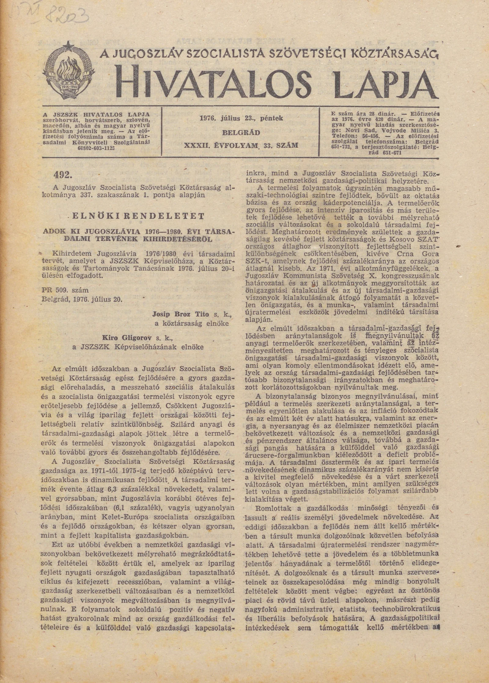 A Jugoszláv Szocialista Szövetségi Köztársaság Hivatalos Lapja, 32. évf. 1976. július 23. 33. sz. 789–876. oldal