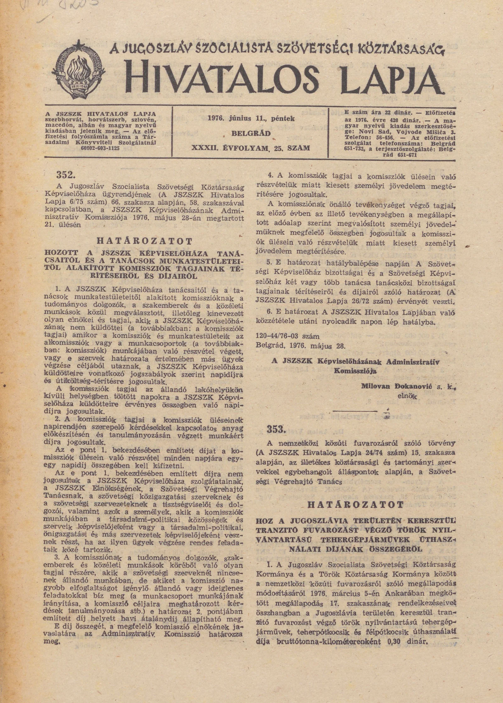 - Határozat A Jugoszláv Szocialista Szövetségi Köztársaság és a Magyar Népköztársaság közötti 1975. évi árucsere-forgalmi jegyzőkönyv megerősítéséről656