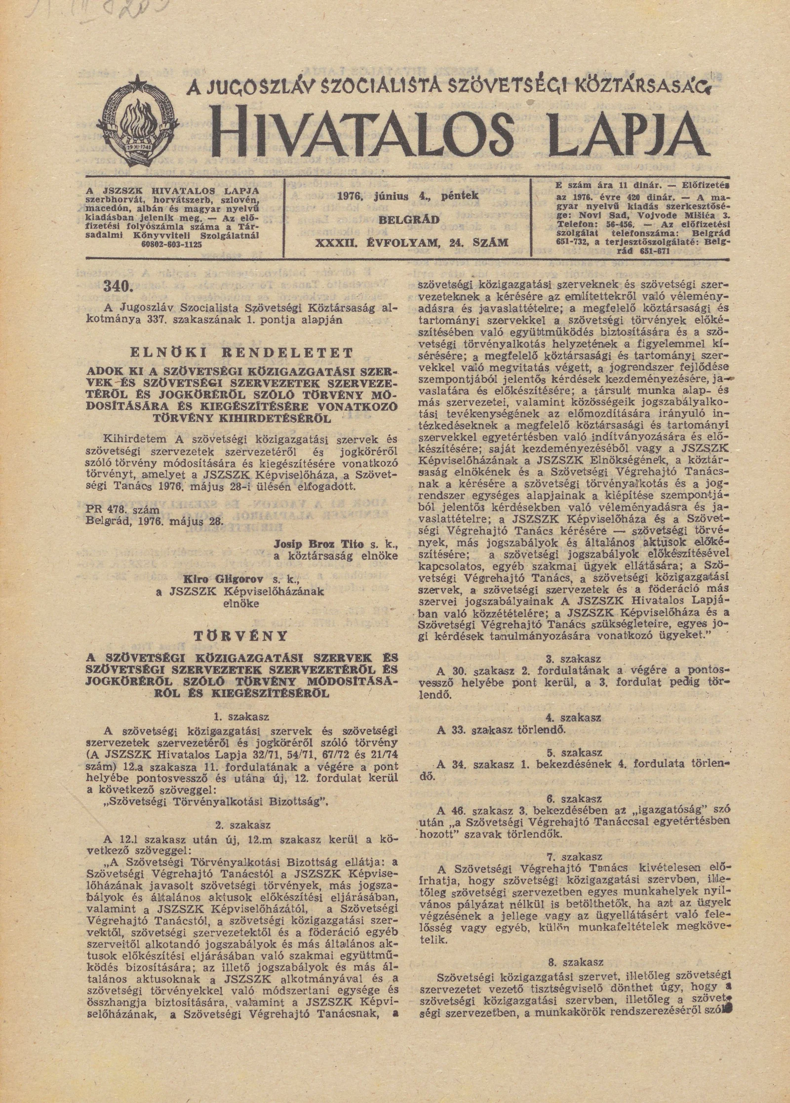 A Jugoszláv Szocialista Szövetségi Köztársaság Hivatalos Lapja, 32. évf. 1976. június 4. 24. sz. 581–604. oldal