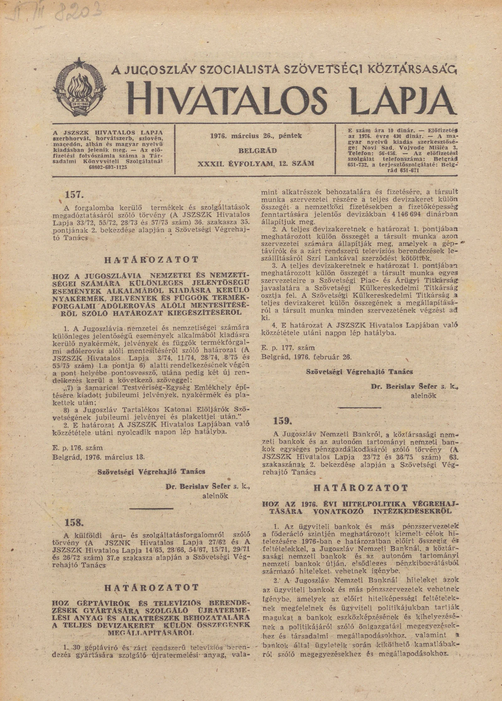 - Határozat A Jugoszlávia nemzetei és nemzetiségei számára különleges jelentőségű események alkalmából kiadásra kerülő nyakérmék, jelvények és függők termékforgalmi adólerovás alóli mentesítéséről szóló határozat kiegészítéséről313