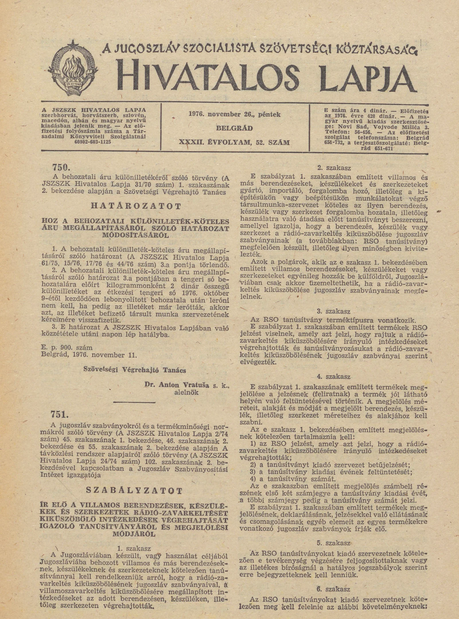 - A Jugoszláv Szocialista Szövetségi Köztársaság Hivatalos Lapja