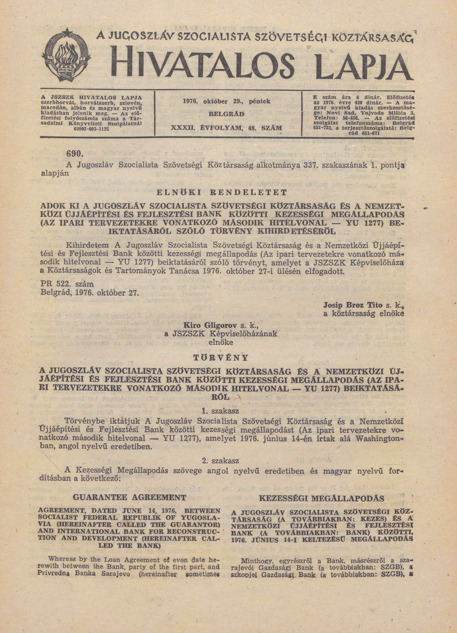 A Jugoszláv Szocialista Szövetségi Köztársaság Hivatalos Lapja, 32. évf. 1976. október 29. 48. sz. 1397–1420. oldal