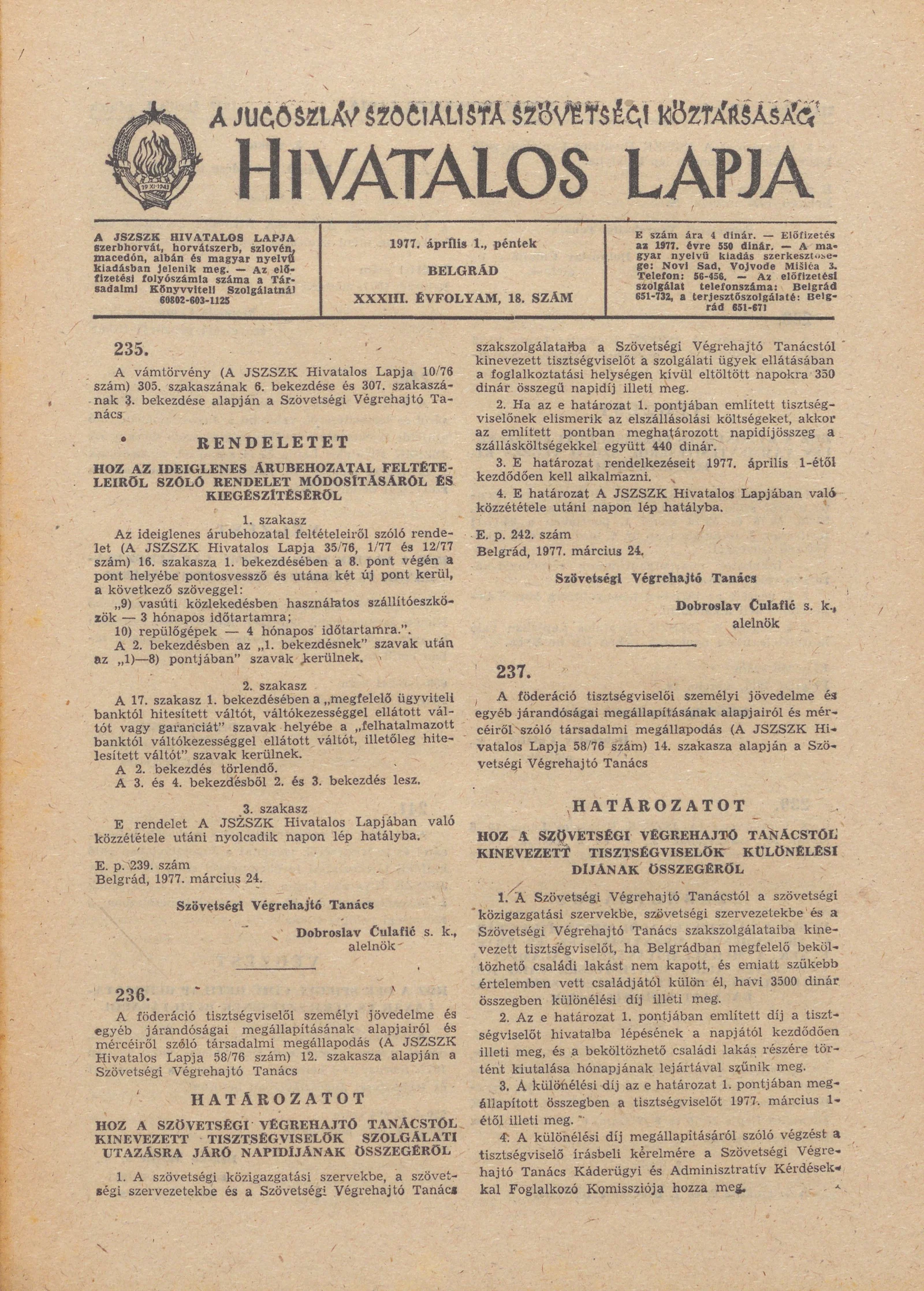 A Jugoszláv Szocialista Szövetségi Köztársaság Hivatalos Lapja, 33. évf. 1977. április 1. 18. sz. 713–728. oldal