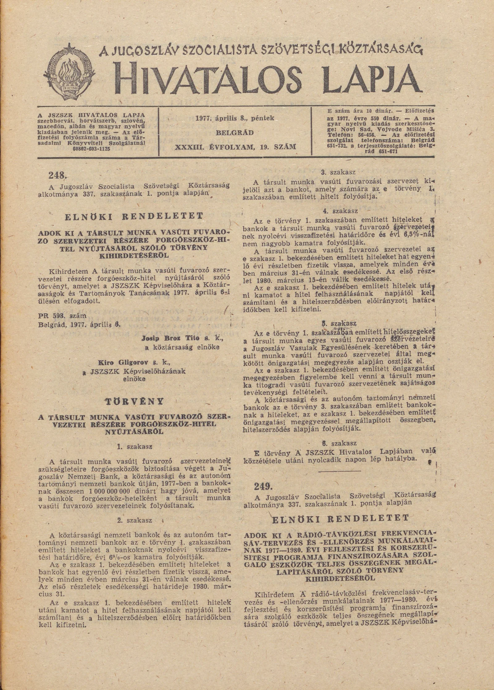 A Jugoszláv Szocialista Szövetségi Köztársaság Hivatalos Lapja, 33. évf. 1977. április 8. 19. sz. 729–768. oldal