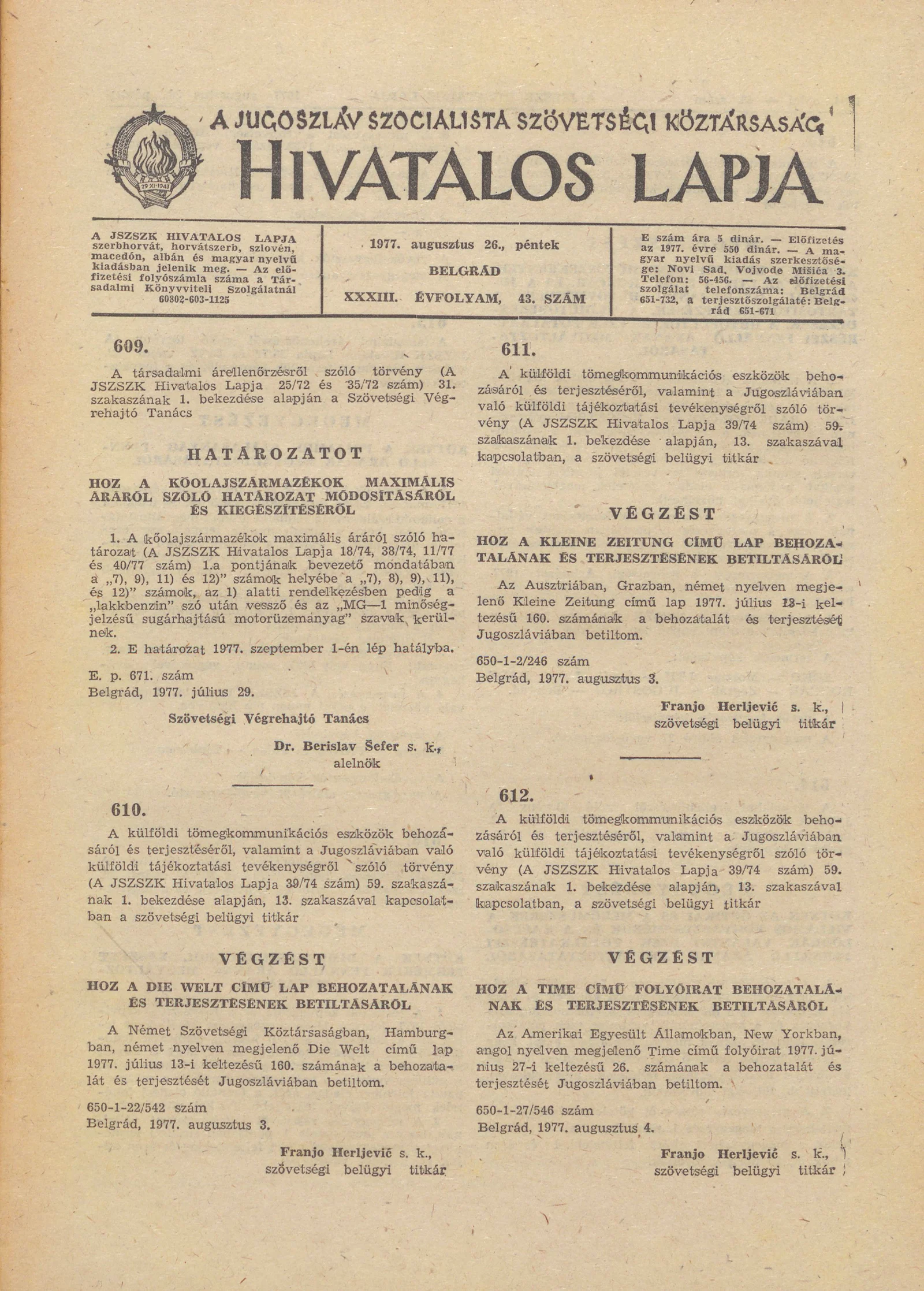 A Jugoszláv Szocialista Szövetségi Köztársaság Hivatalos Lapja, 33. évf. 1977. augusztus 26. 43. sz. 1693–1712. oldal