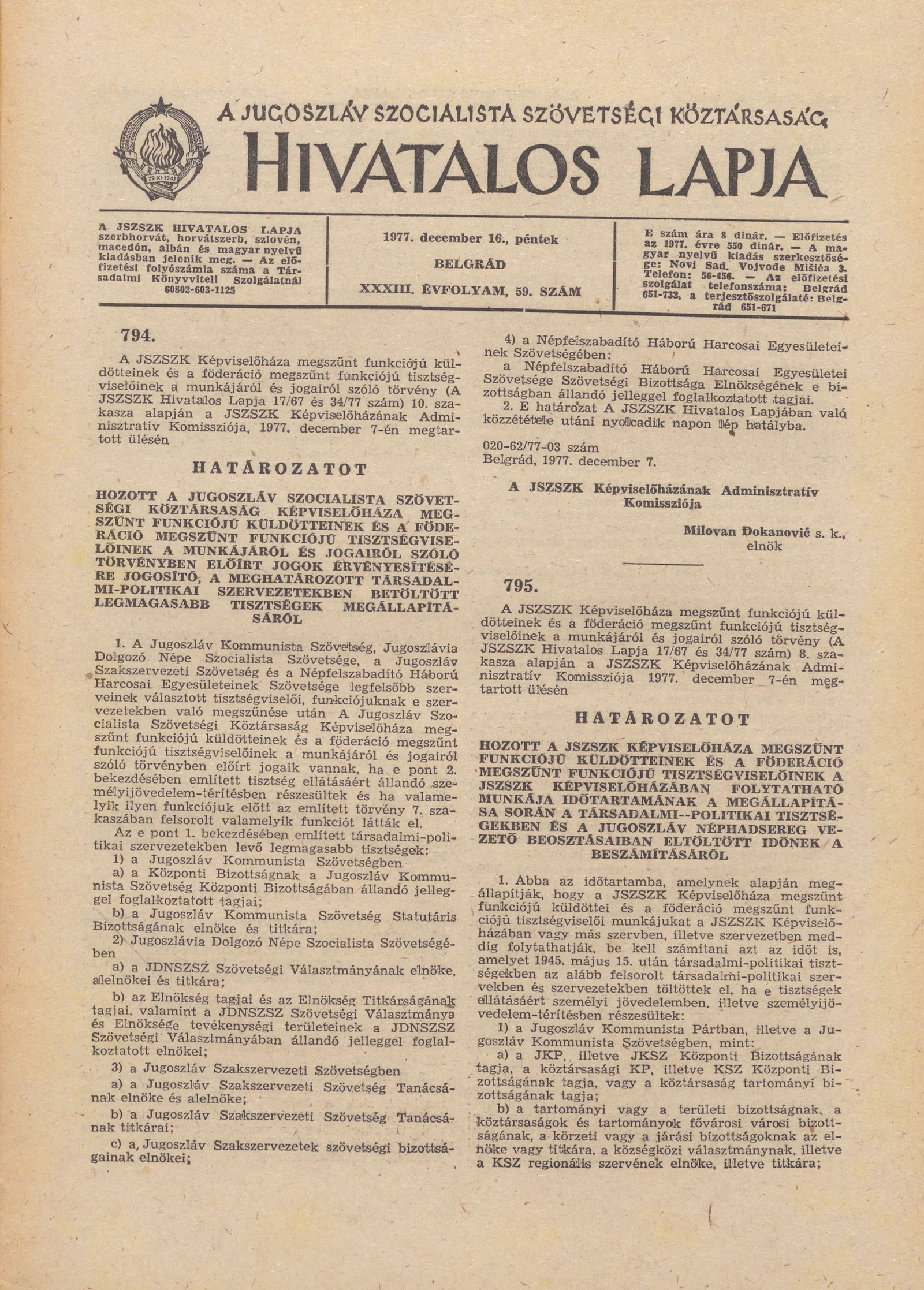 - Határozat A Jugoszláv Szocialista Szövetségi Köztársaság Képviselőháza megszűnt funkciójú küldötteinek és a föderáció megszűnt funkciójú tisztségviselőinek a munkájáról és jogairól szóló törvényben előírt jogok érvényesítésére jogosító, a meghatároz...2033