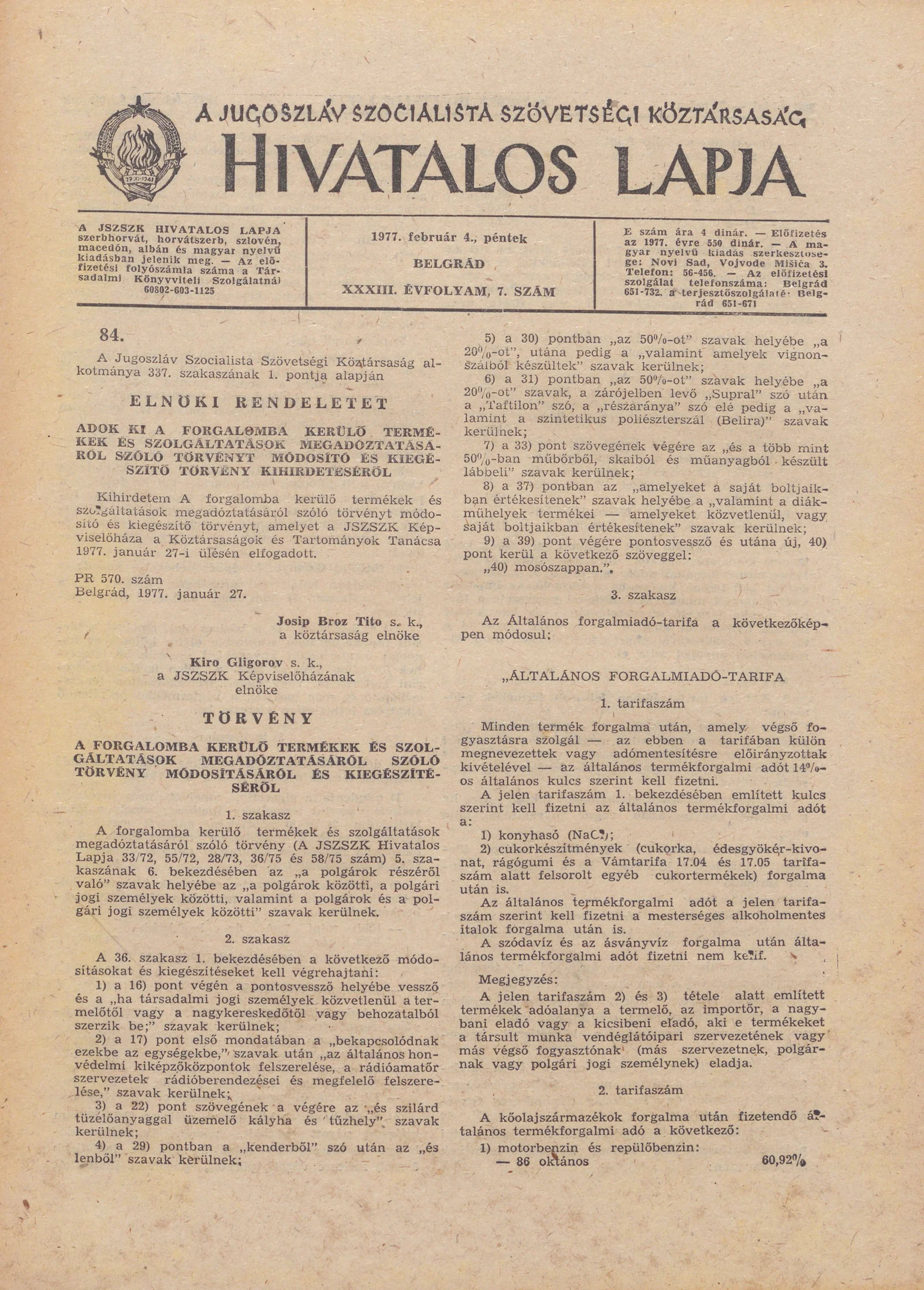 - A Jugoszláv Szocialista Szövetségi Köztársaság Hivatalos Lapja