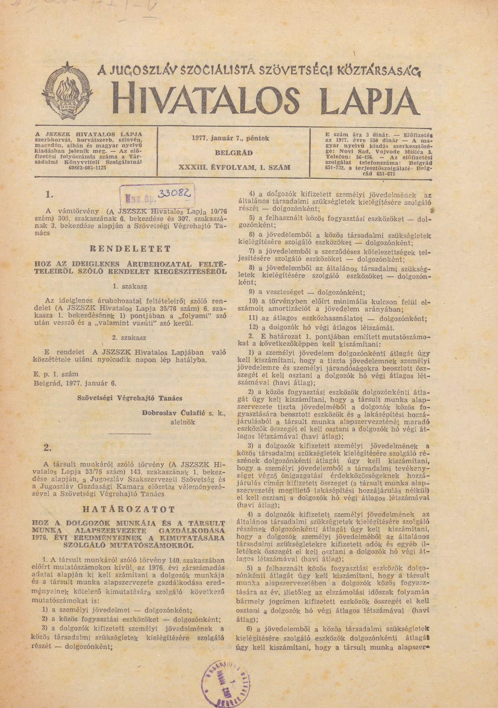 A Jugoszláv Szocialista Szövetségi Köztársaság Hivatalos Lapja, 33. évf. 1977. január 7. 1. sz. 1–12. oldal