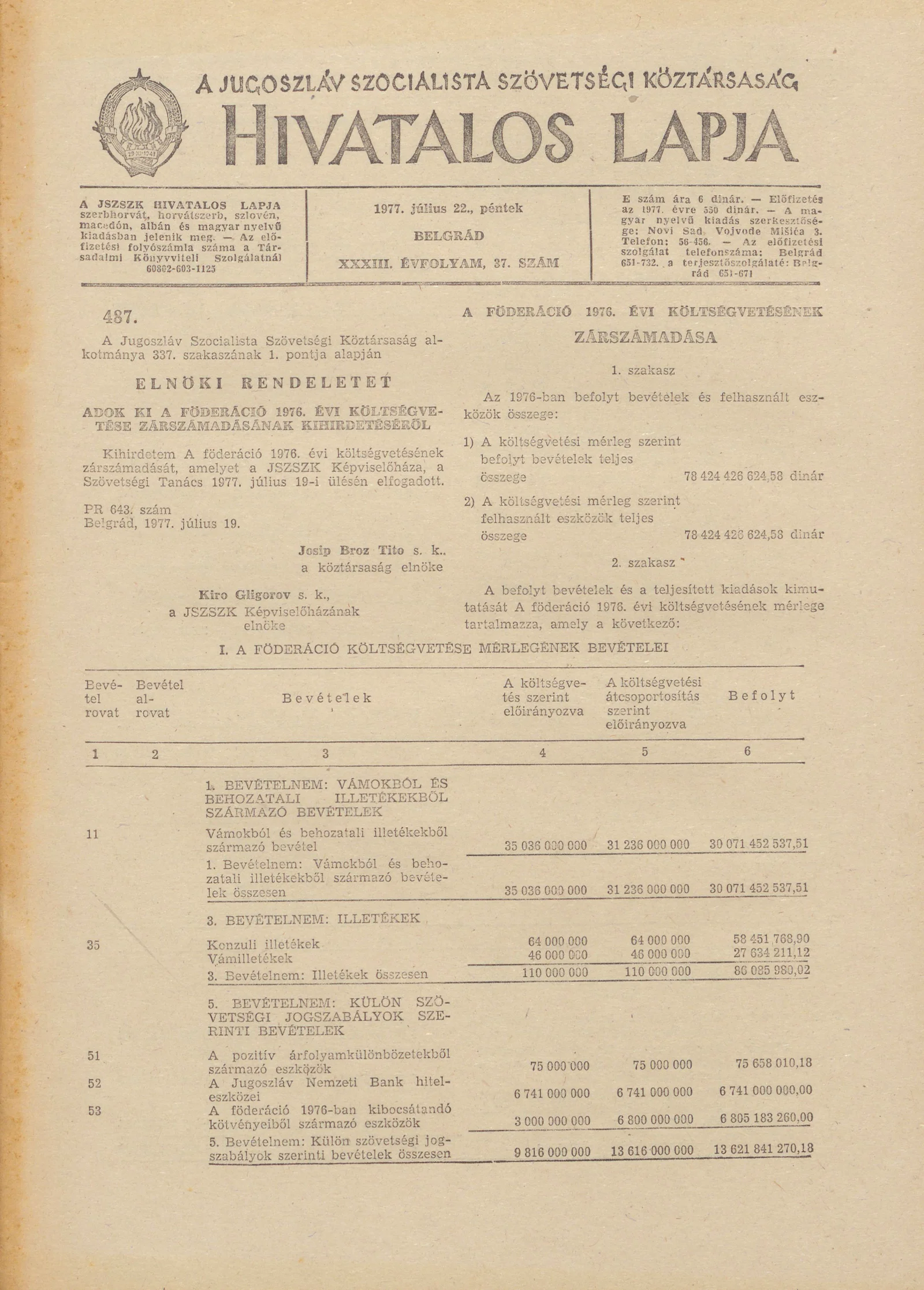 A Jugoszláv Szocialista Szövetségi Köztársaság Hivatalos Lapja, 33. évf. 1977. július 22. 37. sz. 1485–1508. oldal