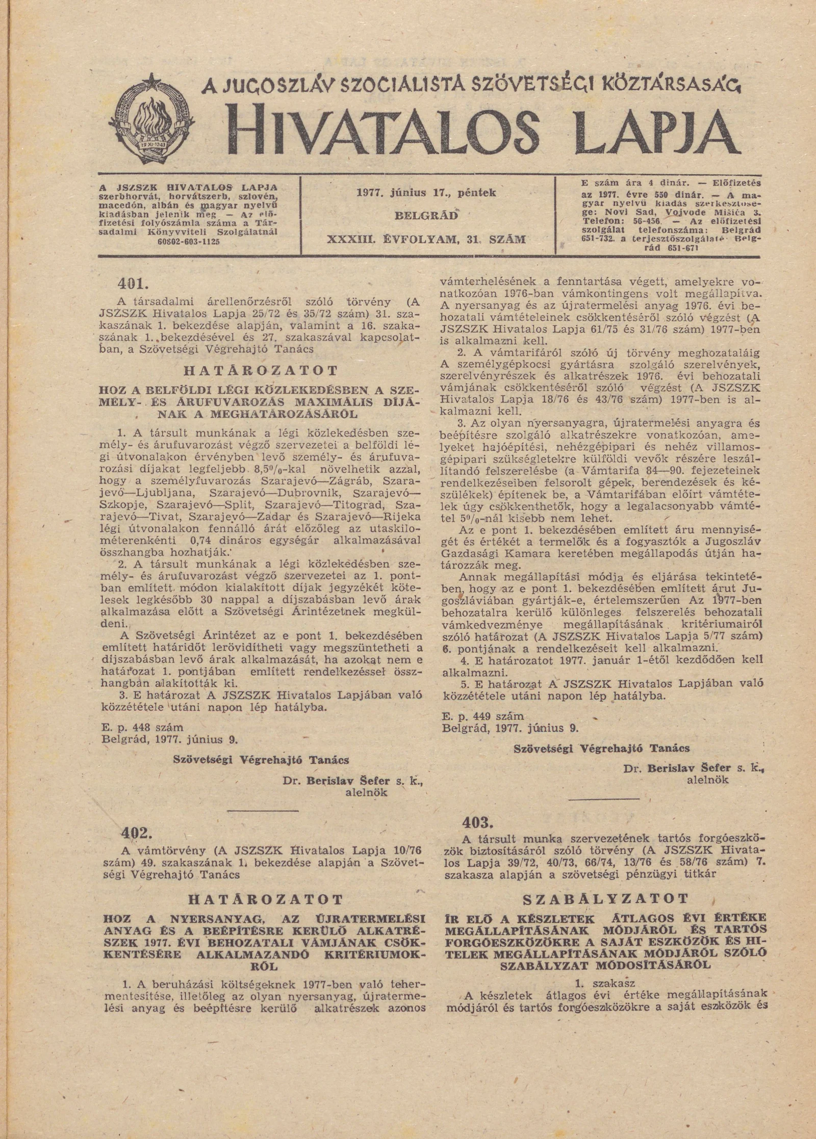 A Jugoszláv Szocialista Szövetségi Köztársaság Hivatalos Lapja, 33. évf. 1977. június 17. 31. sz. 1305–1320. oldal