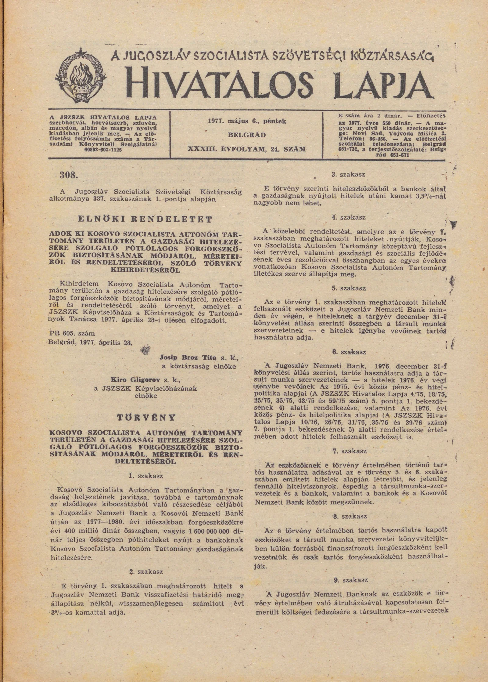 A Jugoszláv Szocialista Szövetségi Köztársaság Hivatalos Lapja, 33. évf. 1977. május 6. 24. sz. 1077–1084. oldal
