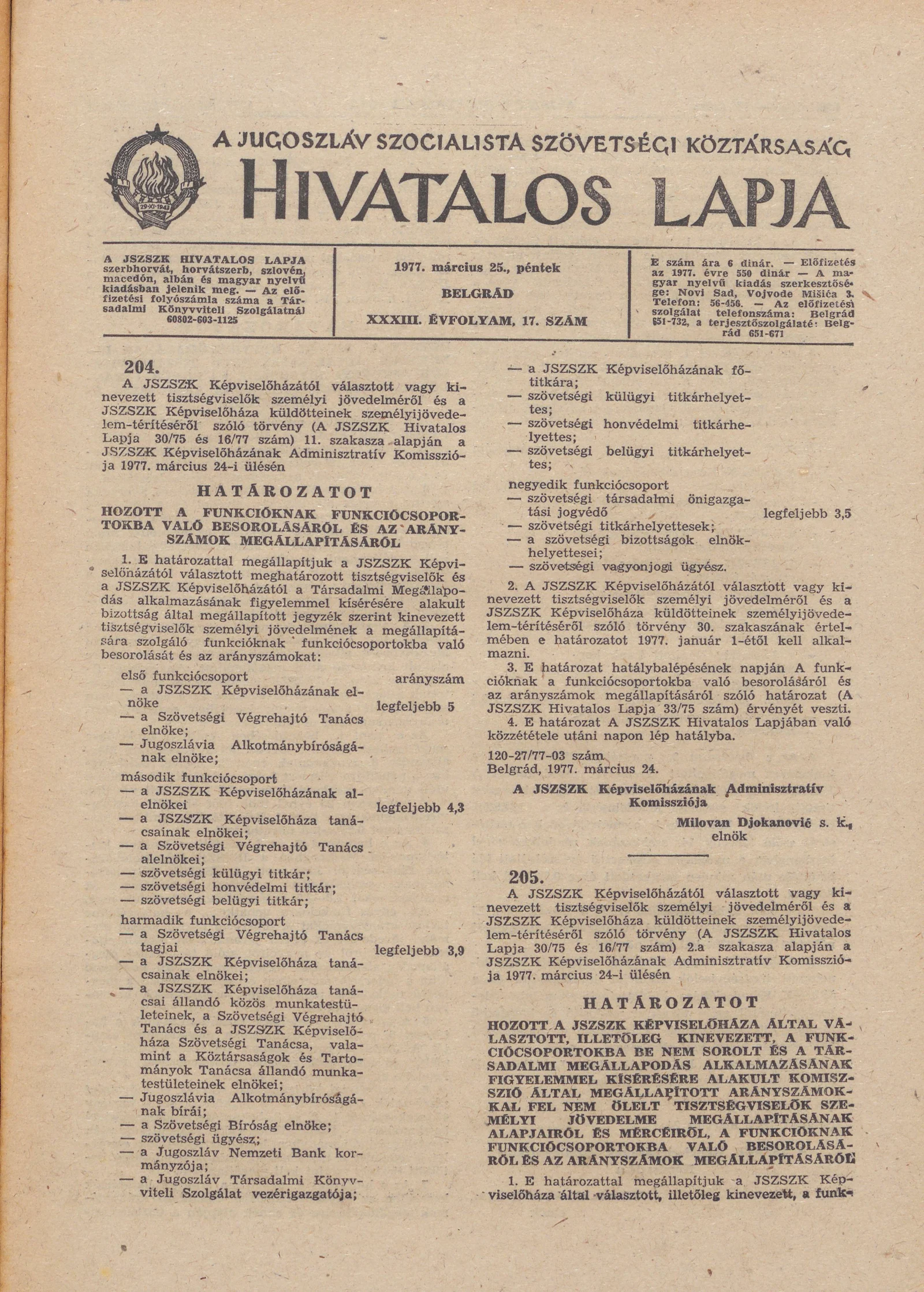 - Határozat a JSZSZK Képviselőháza által választott, illetőleg kinevezett, a funkciócsoportokba be nem sorolt és a társadalmi megállapodás alkalmazásának figyelemmel kísérésére alakult komisszió által megállapított arányszámokkal fel nem ölelt tisztség...689