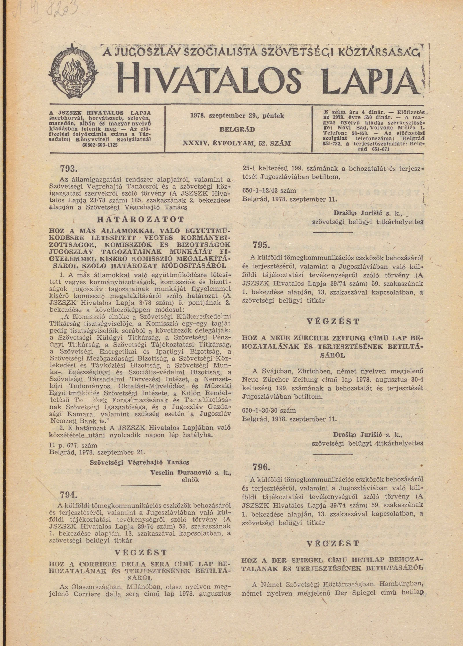 A Jugoszláv Szocialista Szövetségi Köztársaság Hivatalos Lapja, 34. évf. 1978. szeptember 29. 52. sz. 2181–2196. oldal