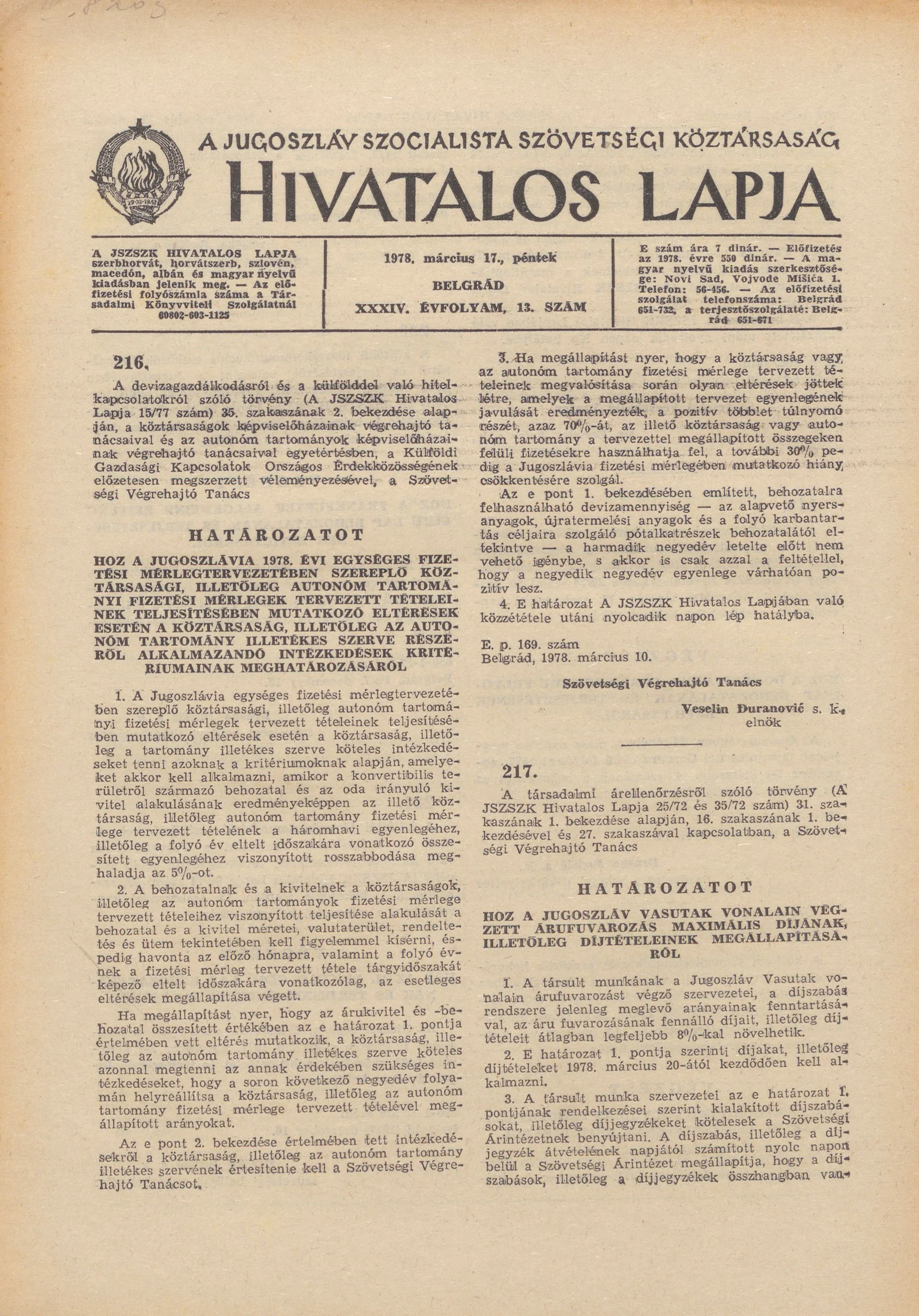 - Határozat a Jugoszláv Vasutak vonalain végzett árufuvarozás maximális díjának, illetőleg díjtételeinek megállapításáról377