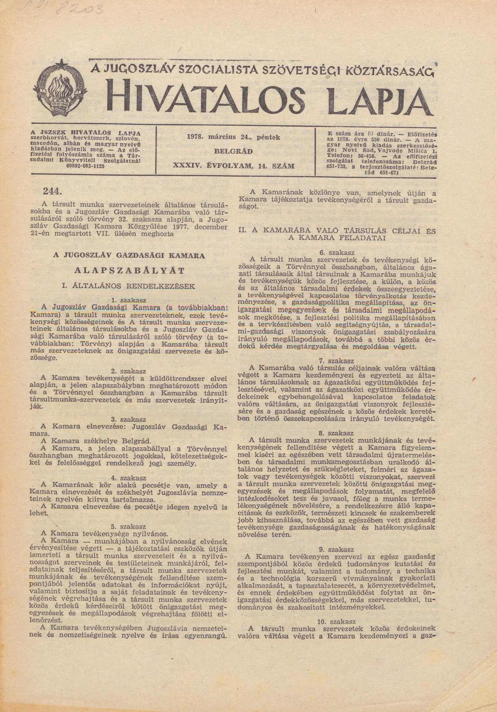 A Jugoszláv Szocialista Szövetségi Köztársaság Hivatalos Lapja, 34. évf. 1978. március 24. 14. sz. 405–444. oldal