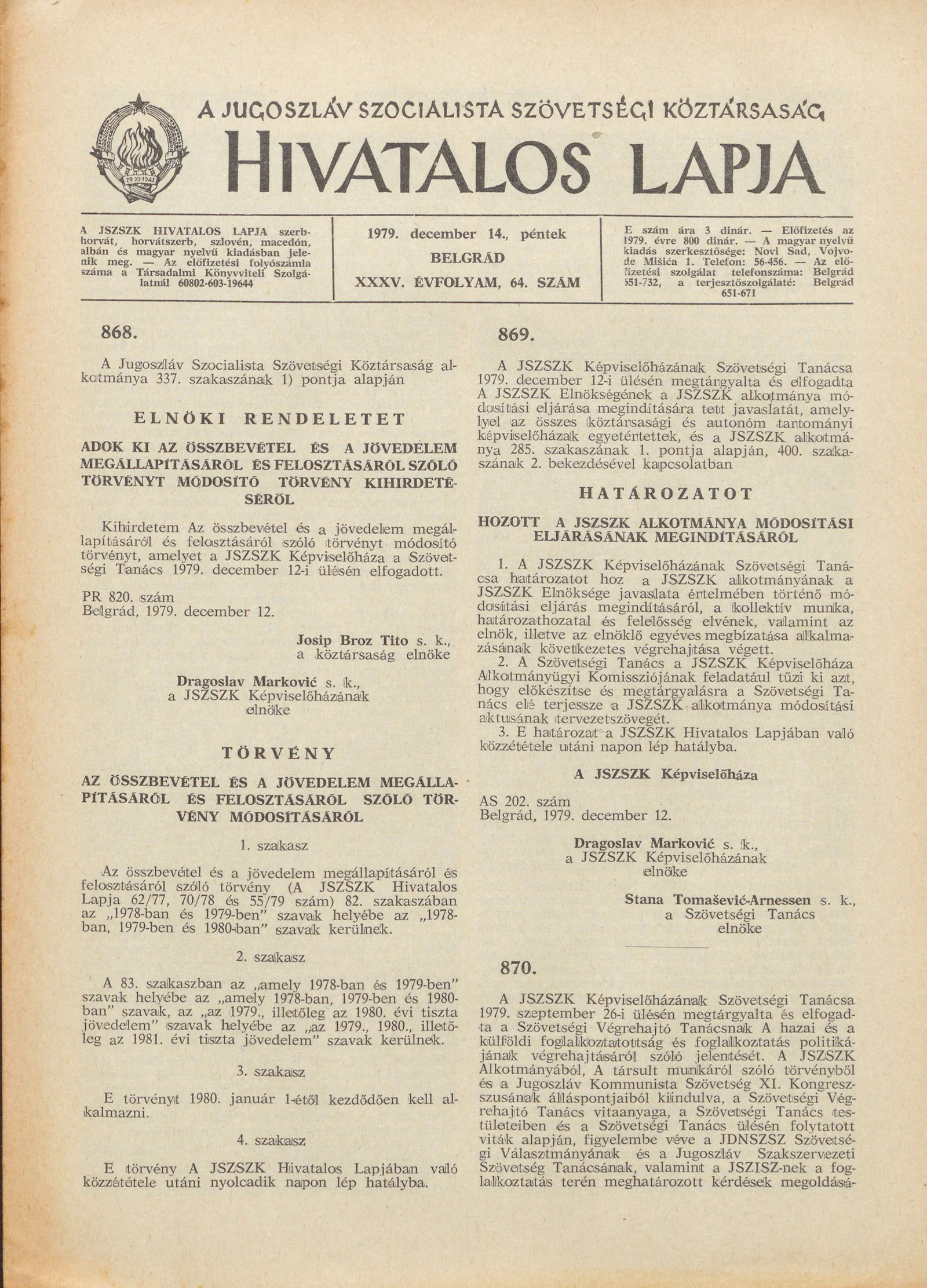 A Jugoszláv Szocialista Szövetségi Köztársaság Hivatalos Lapja, 35. évf. 1979. december 14. 64. sz. 1869–1876. oldal