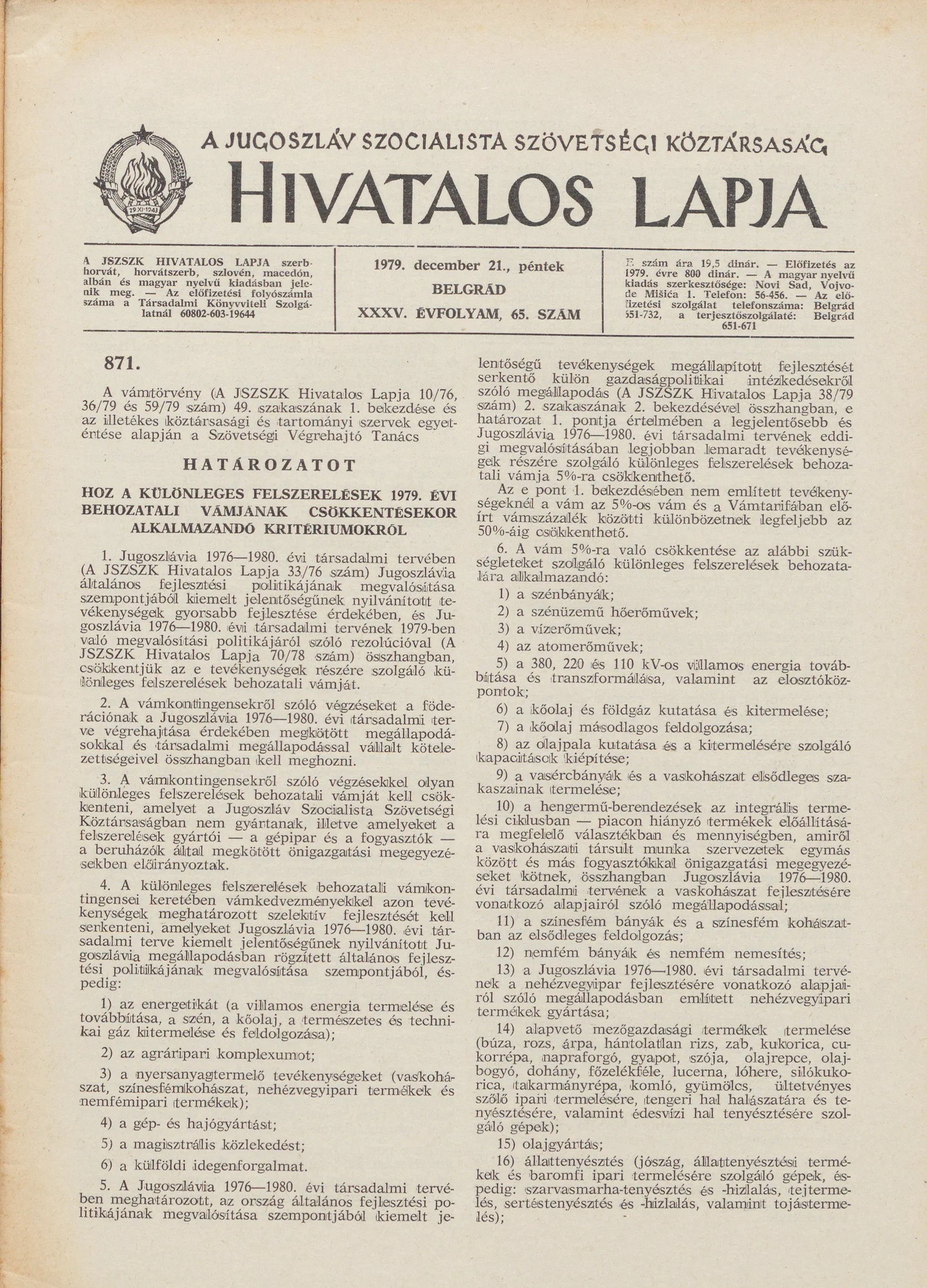 - Határozat a különleges felszerelések 1979. évi behozatali vámjának csökkentésekor alkalmazandó kritériumokról 1877