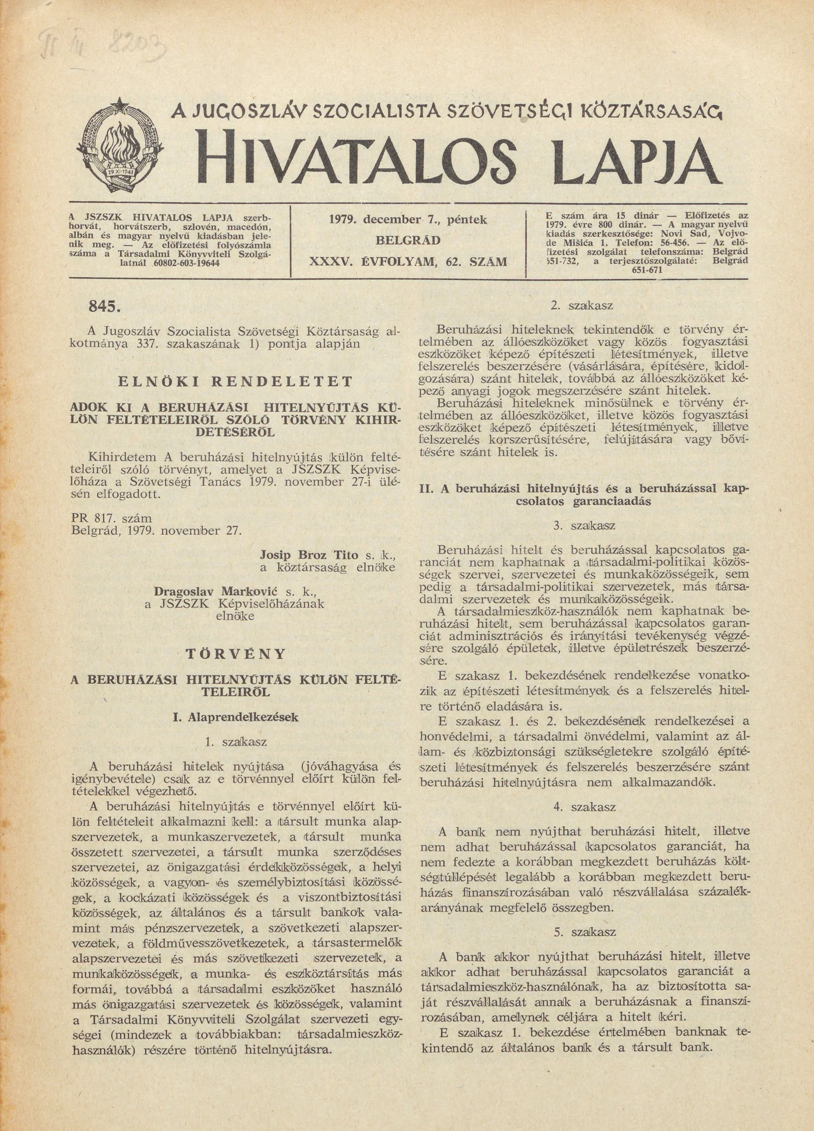 A Jugoszláv Szocialista Szövetségi Köztársaság Hivatalos Lapja, 35. évf. 1979. december 7. 62. sz. 1797–1836. oldal