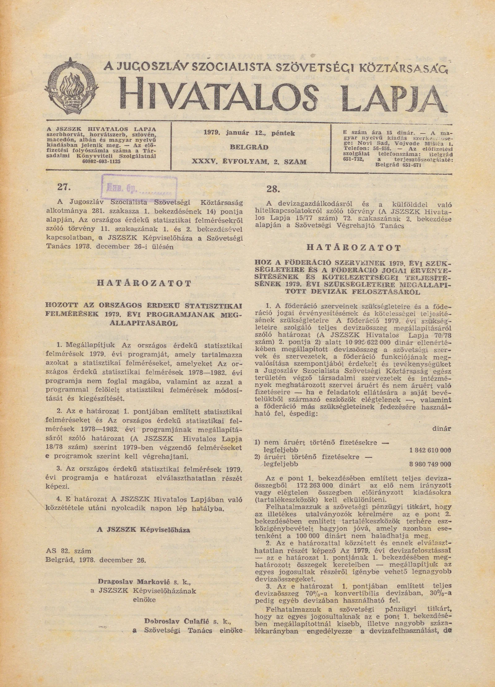 A Jugoszláv Szocialista Szövetségi Köztársaság Hivatalos Lapja, 35. évf. 1979. január 12. 2. sz.