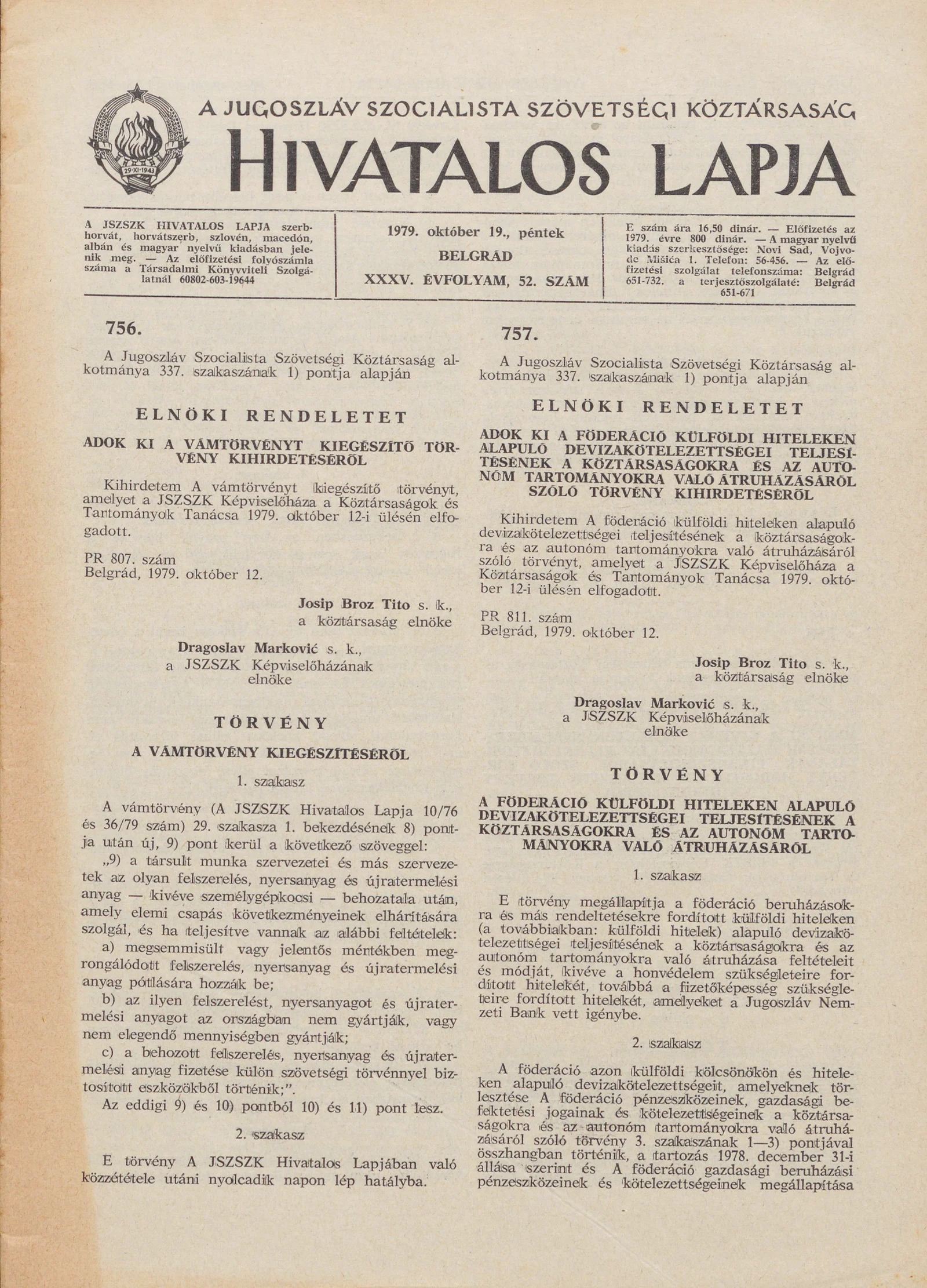 A Jugoszláv Szocialista Szövetségi Köztársaság Hivatalos Lapja, 35. évf. 1979. október 19. 52. sz. 1577–1620. oldal