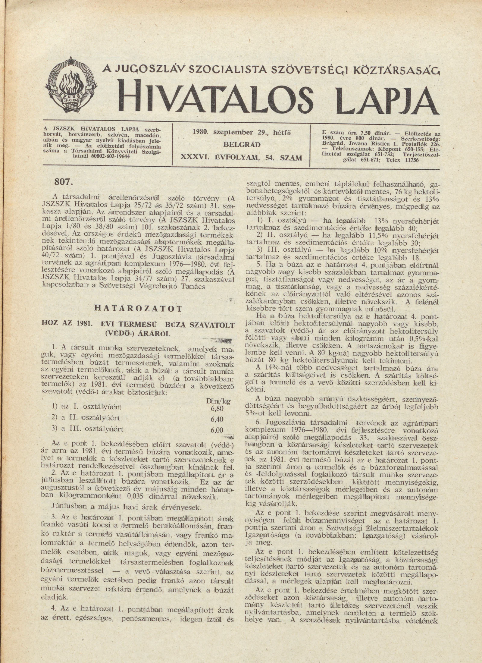 A Jugoszláv Szocialista Szövetségi Köztársaság Hivatalos Lapja, 36. évf. 1980. szeptember 29. 54. sz. 1613–1632. oldal