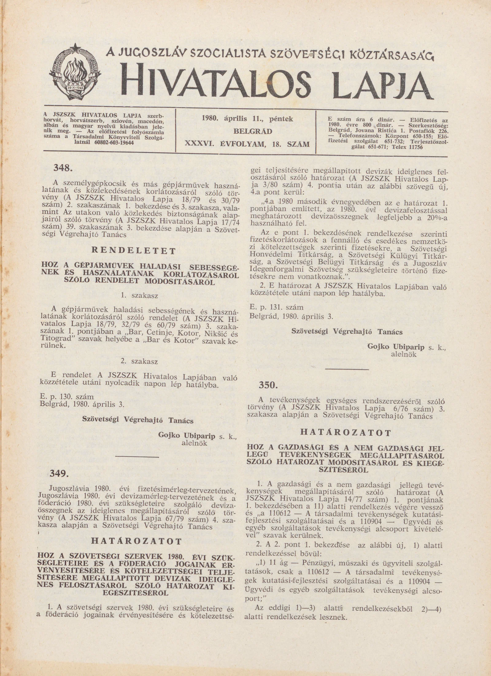 A Jugoszláv Szocialista Szövetségi Köztársaság Hivatalos Lapja, 36. évf. 1980. április 11. 18. sz. 749–764. oldal