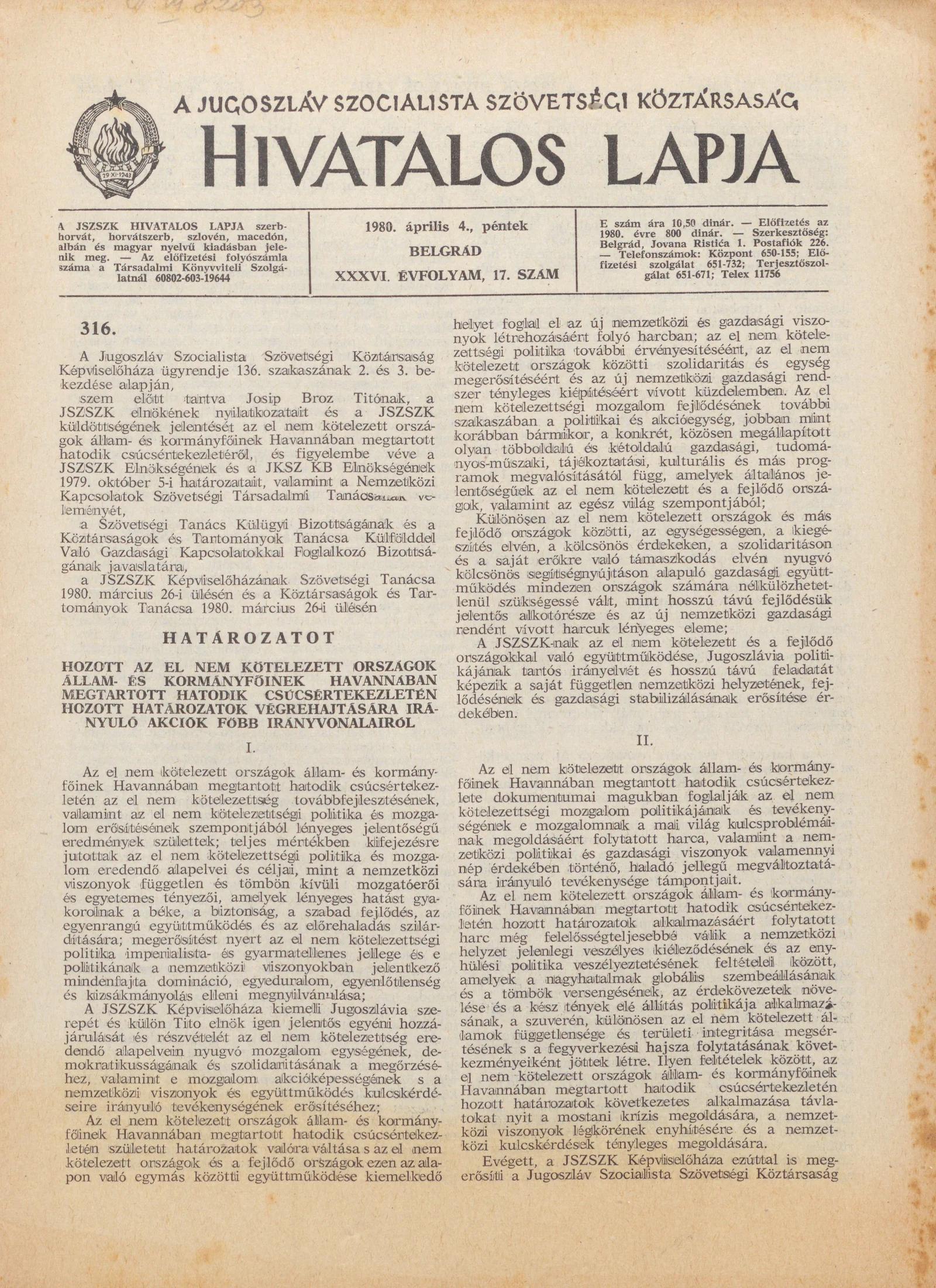 - Határozatok Az el nem kötelezett országok állam- és kormányfőinek Havannában megtartott hatodik csúcsértekezletén hozott határozatok végrehajtására irányuló akciók főbb irányelveiről721