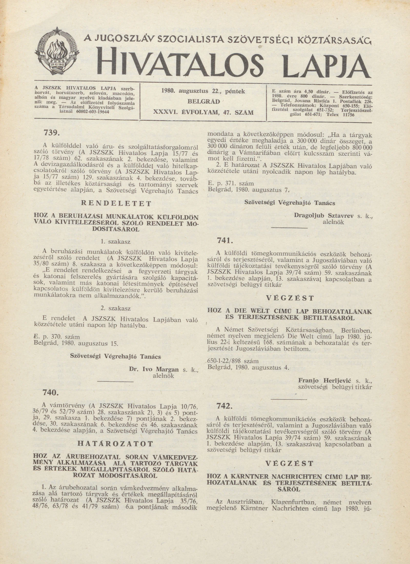 A Jugoszláv Szocialista Szövetségi Köztársaság Hivatalos Lapja, 36. évf. 1980. augusztus 22. 47. sz. 1509–1520. oldal