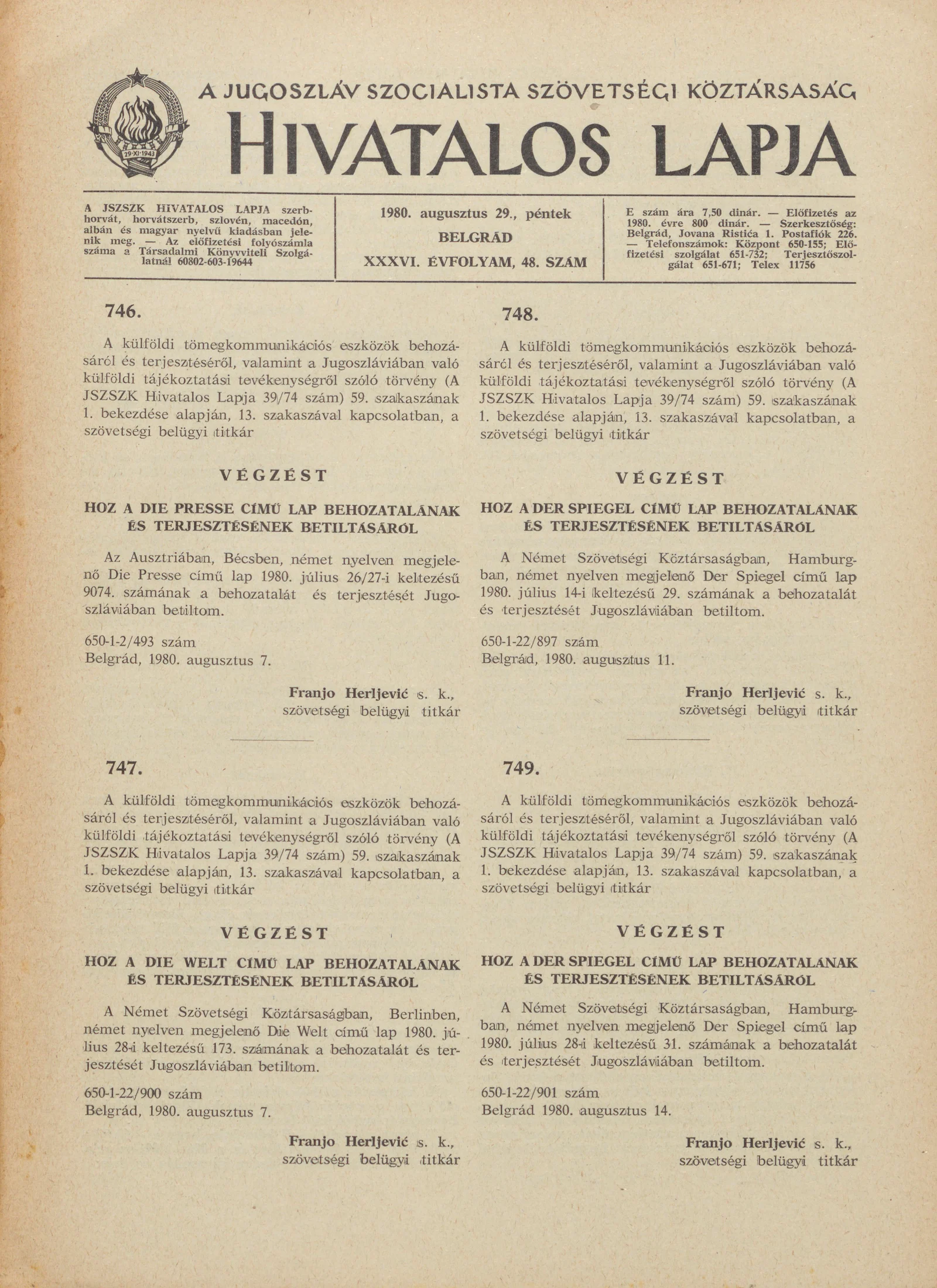 - A Jugoszláv Szocialista Szövetségi Köztársaság Hivatalos Lapja