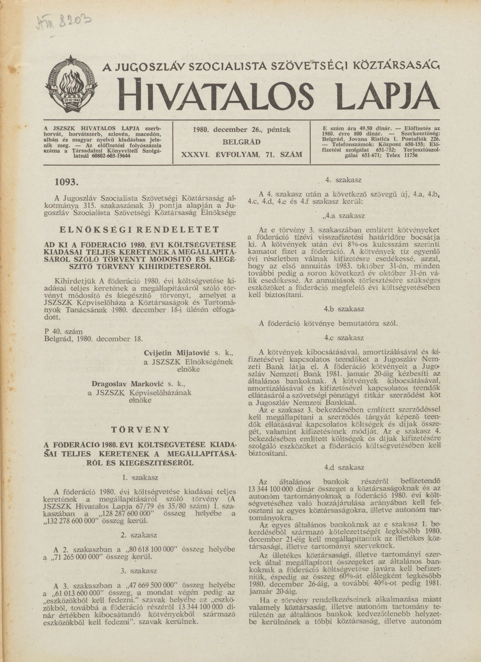A Jugoszláv Szocialista Szövetségi Köztársaság Hivatalos Lapja, 36. évf. 1980. december 26. 71. sz. 2017–2148. oldal