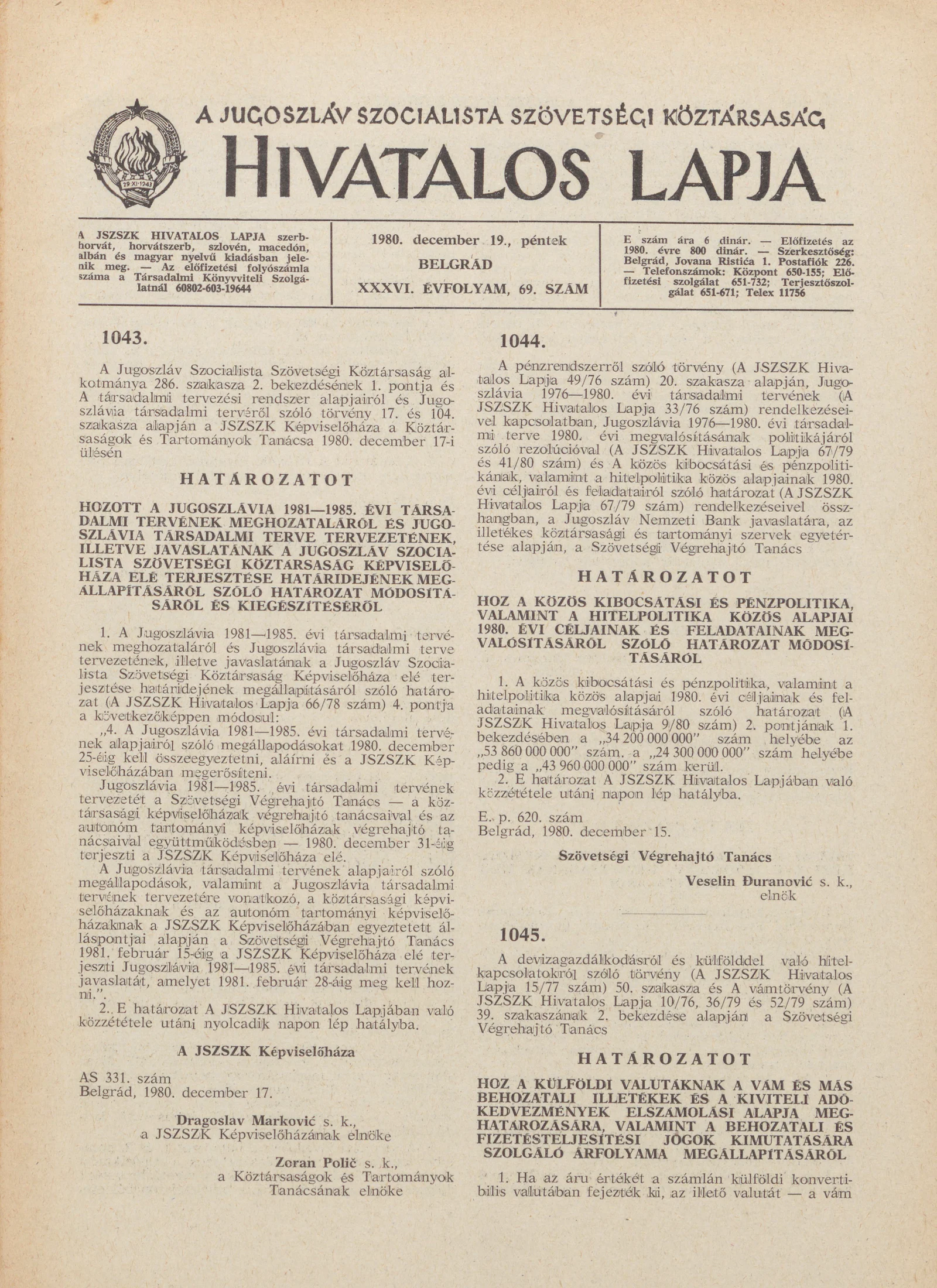 - Határozat A Jugoszlávia 1981–1985. évi társadalmi tervének meghozataláról és Jugoszlávia társadalmi terve tervezetének, illetve javaslatának a Jugoszláv Szocialista Szövetségi Köztársaság Képviselőháza elé terjesztése határidejének megállapításáról...1953