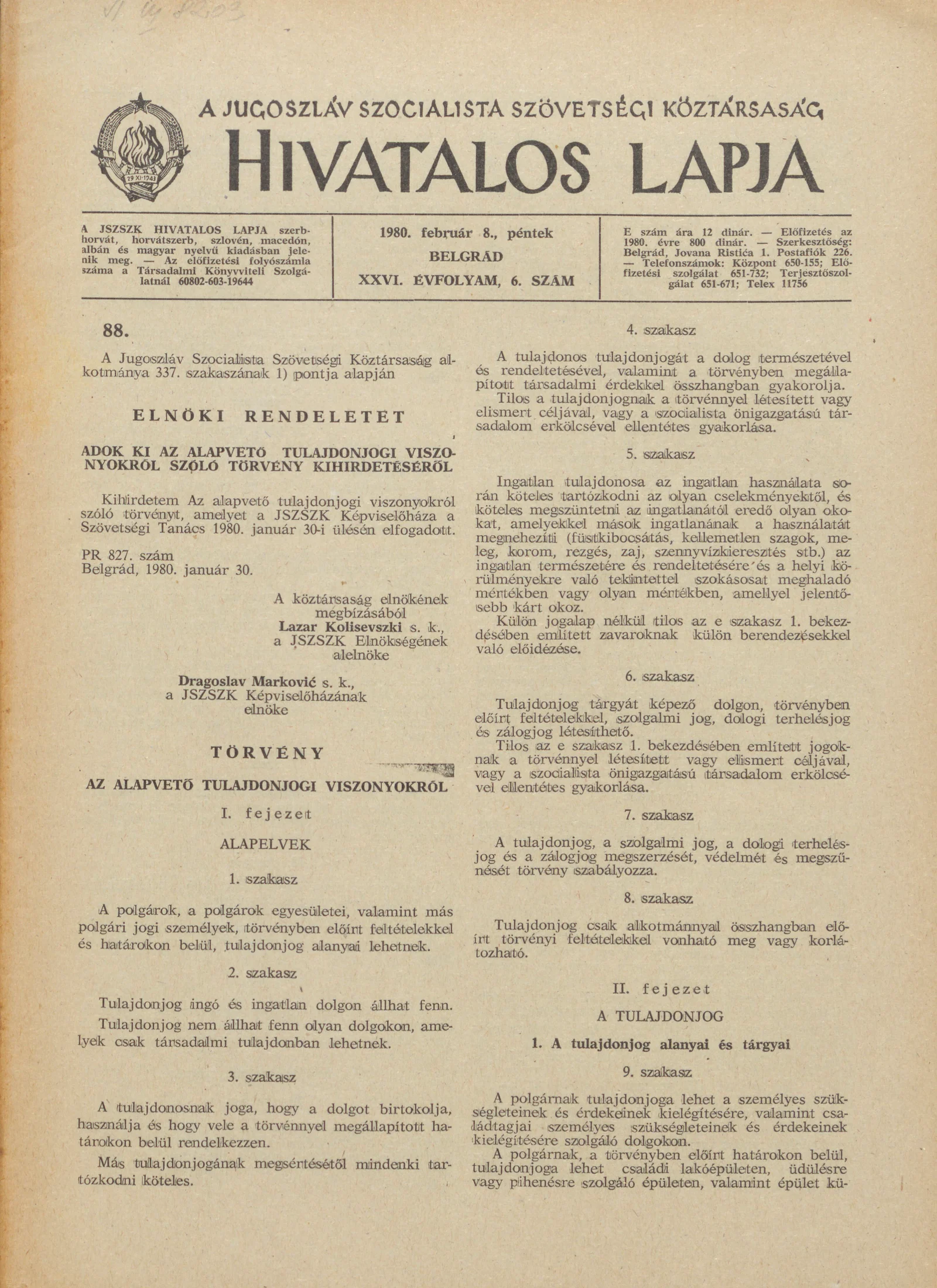A Jugoszláv Szocialista Szövetségi Köztársaság Hivatalos Lapja, 36. évf. 1980. február 8. 6. sz. 189–220. oldal