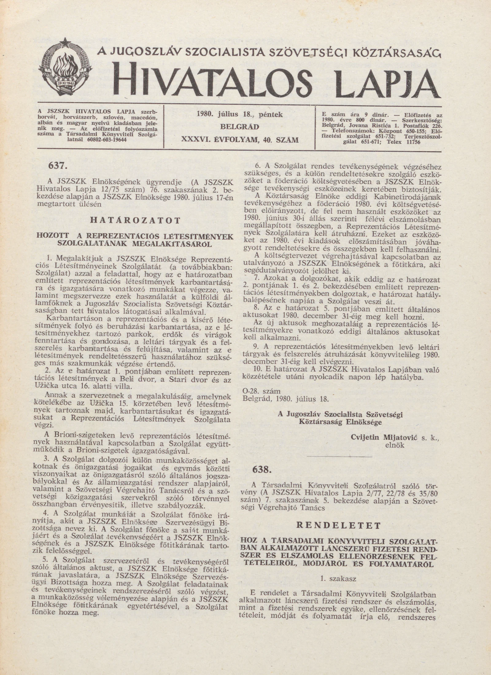 A Jugoszláv Szocialista Szövetségi Köztársaság Hivatalos Lapja, 36. évf. 1980. július 18. 40. sz. 1269–1292. oldal