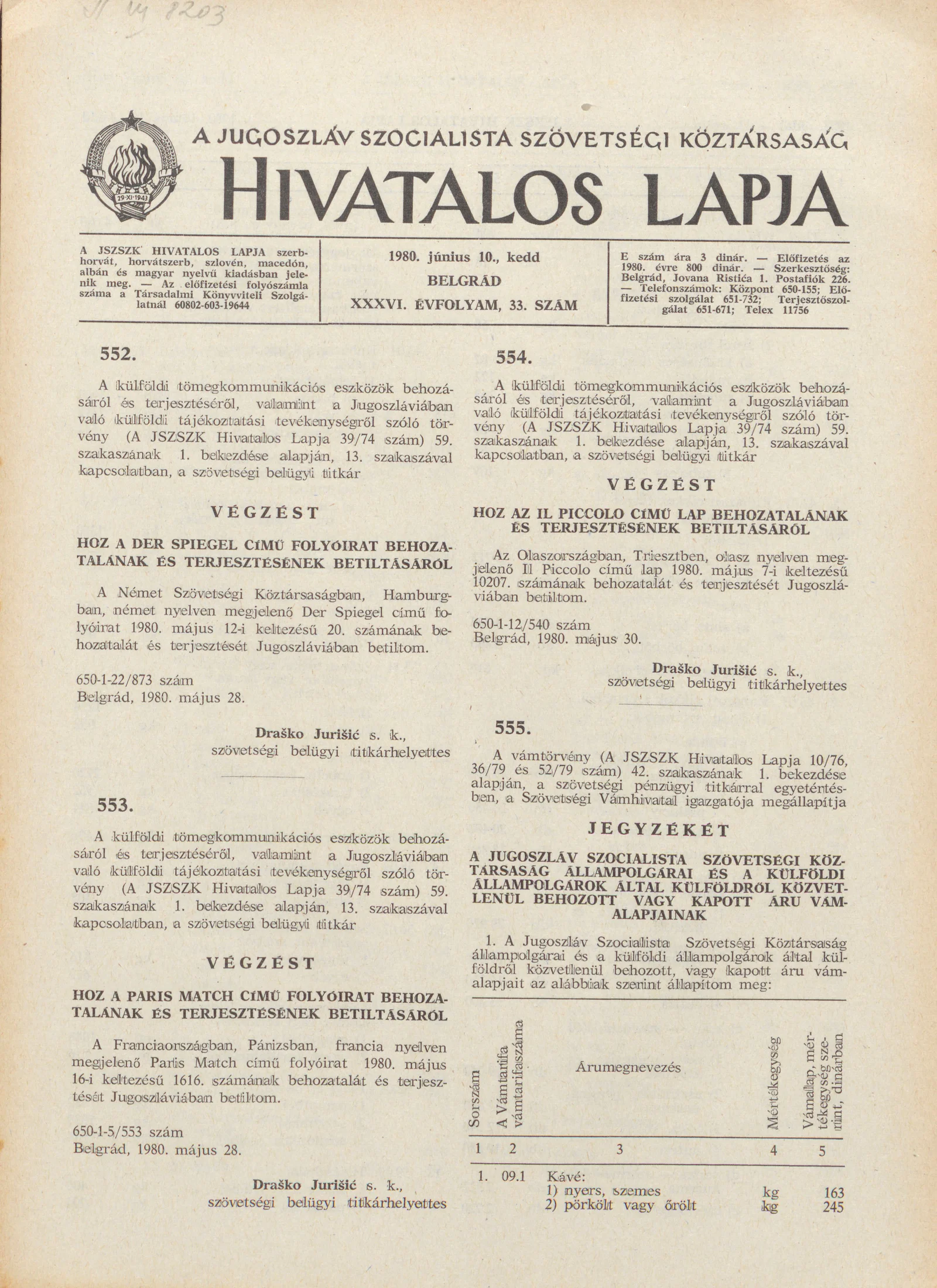 A Jugoszláv Szocialista Szövetségi Köztársaság Hivatalos Lapja, 36. évf. 1980. június 10. 33. sz. 1057–1064. oldal