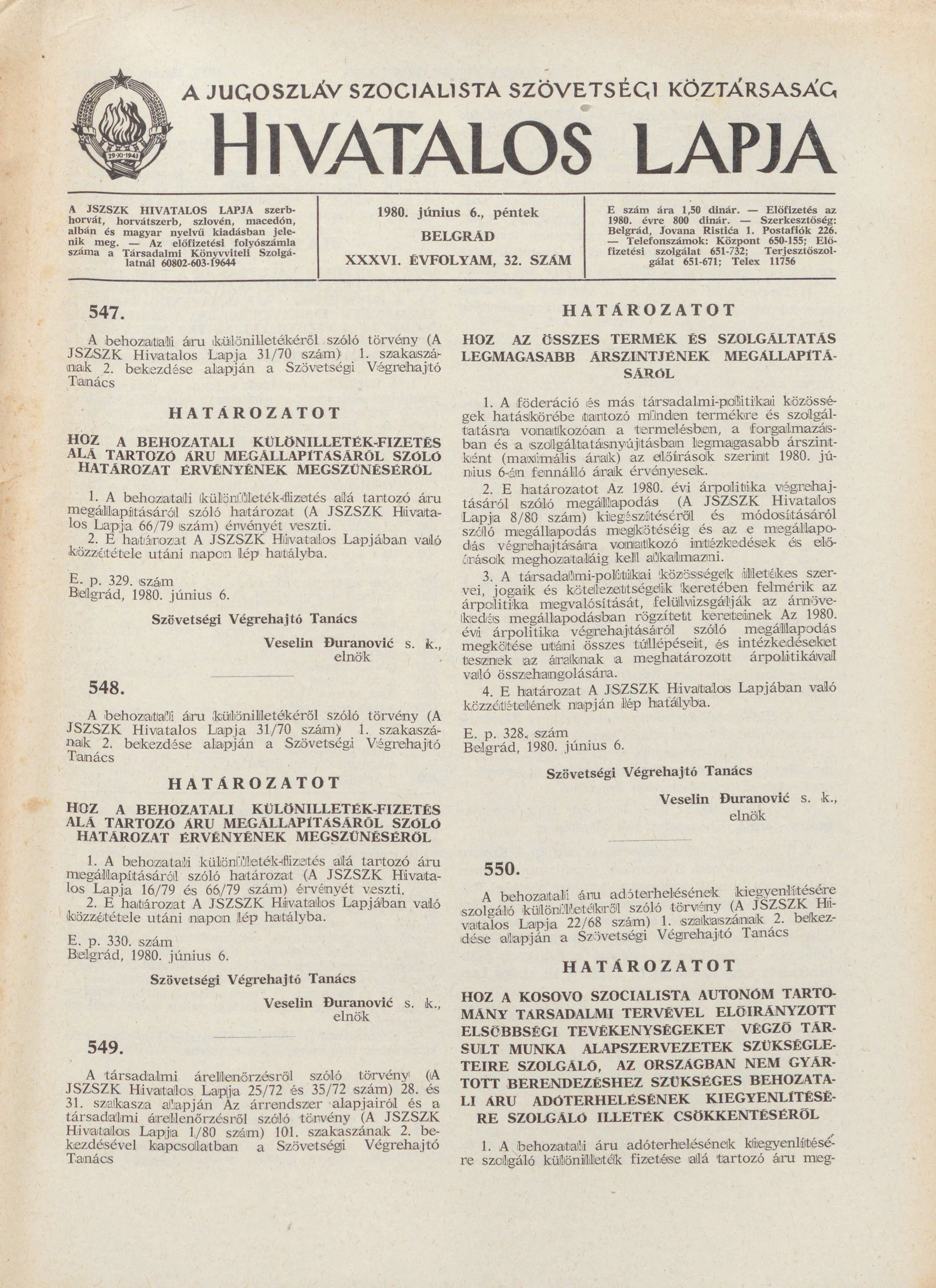 - Határozat a Kosovo Szocialista Autonóm Tartomány társadalmi tervével előirányzott elsőbbségi tevékenységeket végző társult munka alapszervezetek szükségleteire szolgáló, az országban nem gyártott berendezéshez szükséges behozatali áru adóterhelésének...1053
