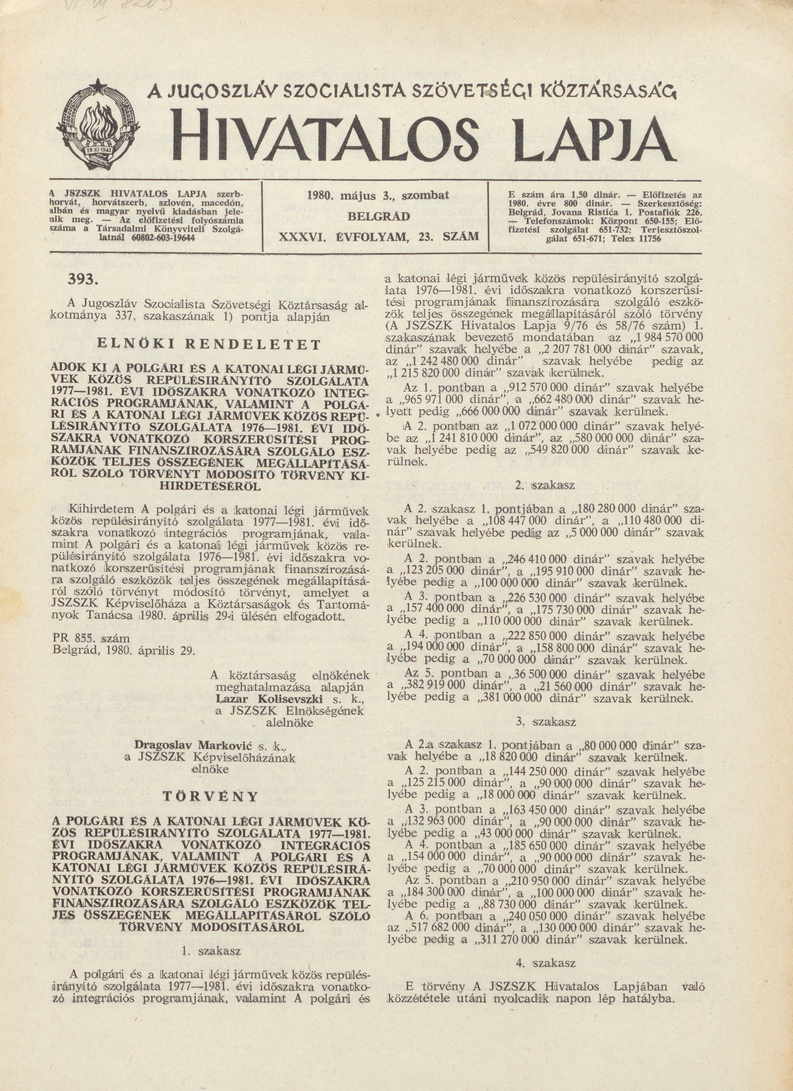 A Jugoszláv Szocialista Szövetségi Köztársaság Hivatalos Lapja, 36. évf. 1980. május 3. 23. sz. 845–848. oldal